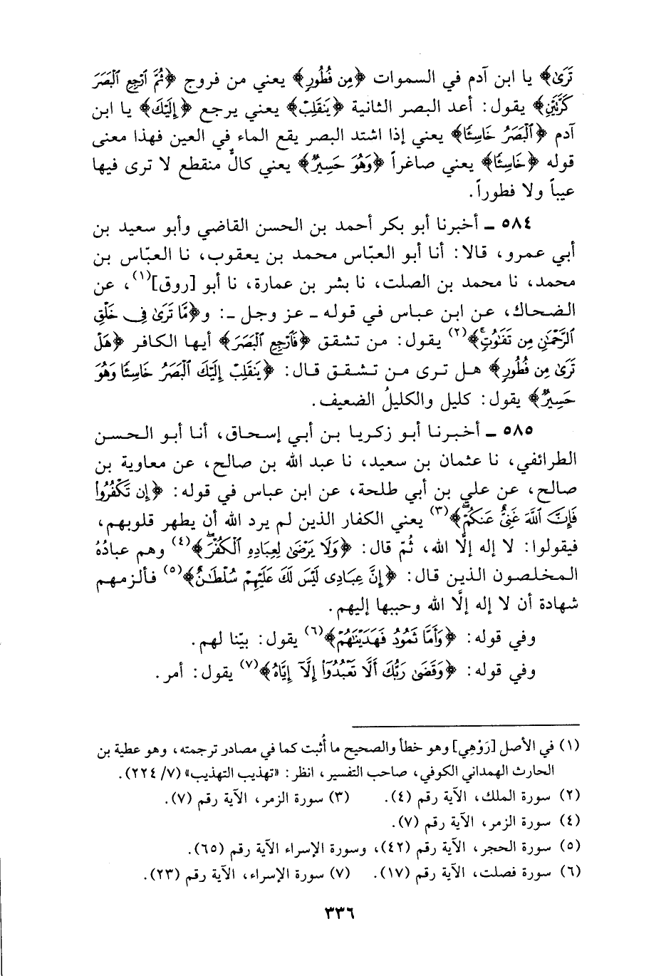 584 - أَخْبَرَنَا أَبُو بَكْرٍ أَحْمَدُ بْنُ الْحَسَنِ الْقَاضِي , وَأَبُو سَعِيدِ بْنُ أَبِي عَمْرٍو قَالَا: أنا أَبُو الْعَبَّاسِ مُحَمَّدُ بْنُ يَعْقُوبَ , نا الْعَبَّاسُ بْنُ مُحَمَّدٍ , نا مُحَمَّدُ بْنُ الصَّلْتِ , نا بِشْرُ بْنُ عُمَارَةَ , نا أَبُو رَوْقٍ , عَنِ الضَّحَّاكِ , عَنِ ابْنِ عَبَّاسٍ فِي قَوْلِهِ عَزَّ وَجَلَّ: " {§مَا تَرَى فِي خَلْقِ الرَّحْمَنِ مِنْ تَفَاوُتٍ} [الملك: 3] يَقُولُ: مِنْ تَشَقُّقٍ {فَارْجِعِ الْبَصَرَ} [الملك: 3] أَيُّهَا الْكَافِرُ {هَلْ تَرَى مِنْ فُطُورٍ} [الملك: 3] هَلْ تَرَى مِنْ تَشَقُّقٍ قَالَ: {يَنْقَلِبْ إِلَيْكَ الْبَصَرُ خَاسِئًا وَهُوَ حَسِيرٌ} يَقُولُ: كَلَيْلٌ وَالْكَلِيلُ الضَّعِيفُ "