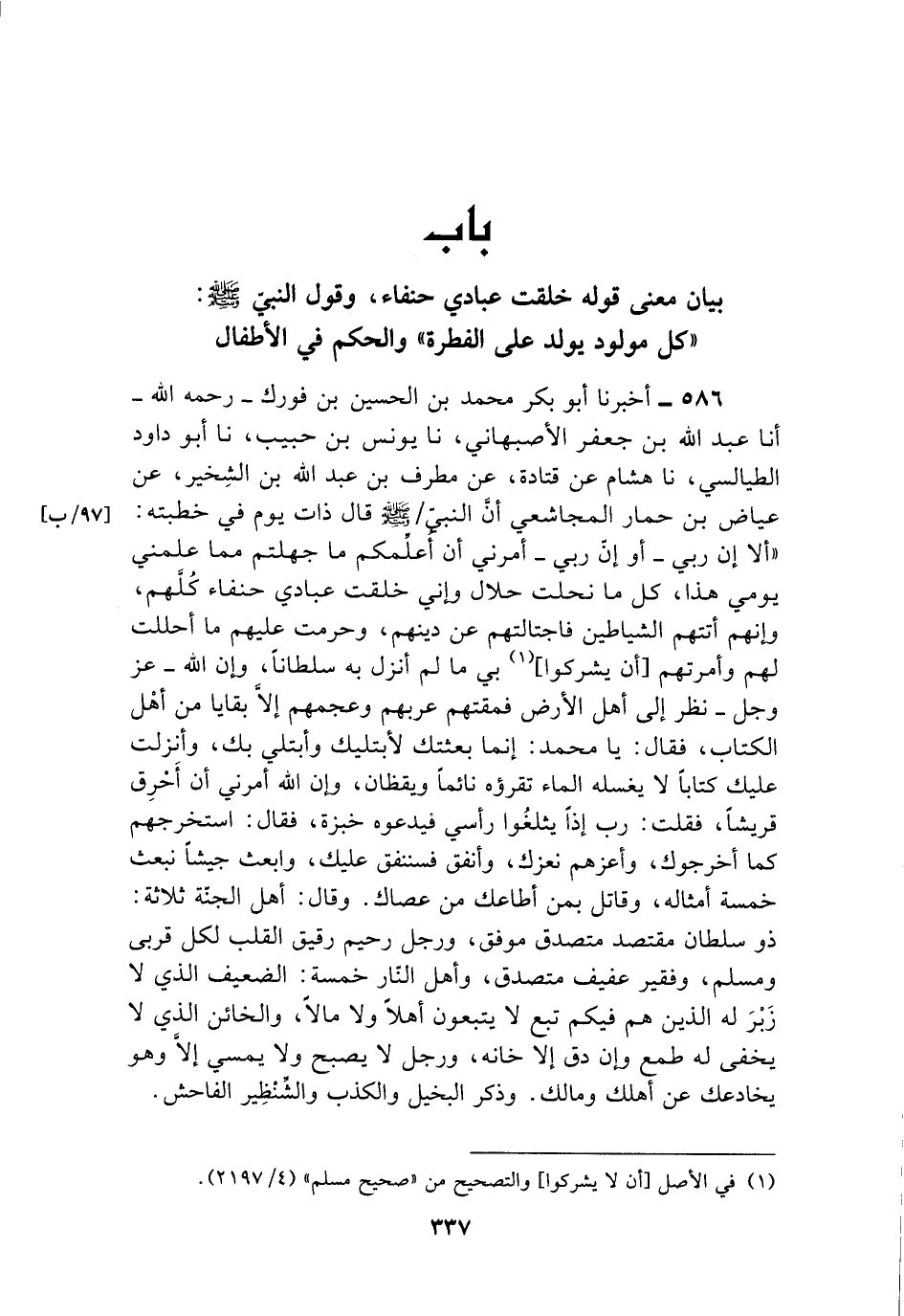 586 - أَخْبَرَنَا أَبُو بَكْرٍ مُحَمَّدُ بْنُ الْحُسَيْنِ بْنِ فُورَكٍ رَحِمَهُ اللَّهُ , أنا عَبْدُ اللَّهِ بْنُ جَعْفَرٍ الْأَصْبَهَانِيُّ , نا يُونُسُ بْنُ حَبِيبٍ , نا أَبُو دَاوُدَ الطَّيَالِسِيُّ , نا هِشَامٌ , عَنْ قَتَادَةَ , عَنْ مُطَرِّفِ بْنِ عَبْدِ اللَّهِ بْنِ الشِّخِّيرِ , عَنْ عِيَاضِ بْنِ حِمَارٍ الْمُجَاشِعِيِّ , أَنَّ النَّبِيَّ صَلَّى اللهُ عَلَيْهِ وَسَلَّمَ قَالَ ذَاتَ يَوْمٍ فِي خُطْبَتِهِ: " أَلَا إِنَّ رَبِّي - أَوْ - إِنَّ رَبِّي أَمَرَنِي أَنْ أُعَلِّمَكُمْ مَا جَهِلْتُمْ مِمَّا عَلَّمَنِي يَوْمِي هَذَا , §كُلُّ مَا نَحَلْتُ حَلَالٌ , وَإِنِّي خَلَقْتُ عِبَادِي حُنَفَاءَ كُلَّهُمْ , وَإِنَّهُمْ أَتَتْهُمُ الشَّيَاطِينُ فَاجْتَالَتْهُمْ عَنْ دِينِهِمْ , وَحَرَّمَتْ عَلَيْهِمْ مَا أَحْلَلْتُ لَهُمْ , وَأَمَرَتْهُمْ أَنْ يُشْرِكُوا بِي مَا لَمْ أُنَزِّلْ بِهِ سُلْطَانًا , وَإِنَّ اللَّهَ عَزَّ وَجَلَّ نَظَرَ إِلَى أَهْلِ الْأَرْضِ فَمَقَتَهُمْ عَرَبَهُمْ وَعَجَمَهُمْ إِلَّا بَقَايَا مِنْ أَهْلِ الْكِتَابِ , فَقَالَ: يَا مُحَمَّدُ: إِنَّمَا بَعَثْتُكَ لِأَبْتَلِيَكَ وَأَبْتَلِيَ بِكَ , وَأَنْزَلْتُ عَلَيْكَ كِتَابًا لَا يَغْسِلُهُ الْمَاءُ تَقْرَؤُهُ نَائِمًا وَيَقْظَانَ , وَإِنَّ اللَّهَ أَمَرَنِي أَنْ أَحْرِقَ قُرَيْشًا , فَقُلْتُ: رَبِّ إِذًا يَثْلَغُوا رَأْسِي فَيَدَعُوهُ خُبْزَةً , فَقَالَ: اسْتَخْرِجْهُمْ كَمَا أَخْرَجُوكَ , وَاغْزُهُمْ نُغْزِكَ , وَأَنْفِقَ فَسَنُنْفِقُ عَلَيْكَ , وَابْعَثْ جَيْشًا نَبْعَثُ خَمْسَةَ أَمْثَالِهِ , وَقَاتِلْ بِمَنْ أَطَاعَكَ مَنْ عَصَاكَ. وَقَالَ: أَهْلُ الْجَنَّةِ ثَلَاثَةٌ: ذُو سُلْطَانٍ مُقْتَصِدٌ مُتَصَدِّقٌ مُوَفَّقٌ , وَرَجُلٌ رَحِيمٌ رَقِيقُ الْقَلْبِ لِكُلِّ قُرْبَى وَمُسْلِمٍ , وَفَقِيرٌ عَفِيفٌ مُتَصَدِّقٌ , وَأَهْلُ النَّارِ خَمْسَةٌ: الضَّعِيفُ الَّذِي لَا زَبْرَ لَهُ الَّذِينَ هُمْ فِيكُمْ تَبَعٌ لَا يَتْبَعُونَ أَهْلًا وَلَا مَالًا , وَالْخَائِنُ الَّذِي لَا يَخْفَى لَهُ طَمَعٌ وَإِنْ دَقَّ إِلَّا خَانَهُ , وَرَجُلٌ لَا يُصْبِحُ وَلَا يُمْسِي إِلَّا وَهُوَ يُخَادِعُكَ عَنْ أَهْلِكَ وَمَالِكَ. وَذَكَرَ الْبَخِيلَ وَالْكَذِبَ وَالشِّنْظِيرَ الْفَاحِشَ" -[338]- أَخْرَجَهُ مُسْلِمٌ فِي الصَّحِيحِ مِنْ وَجْهَيْنِ آخَرَيْنِ , عَنْ هِشَامٍ الدَّسْتُوَائِيِّ , وَمِنْ حَدِيثِ ابْنِ أَبِي عَرُوبَةَ , وَمَطَرٍ الْوَرَّاقِ , عَنْ قَتَادَةَ