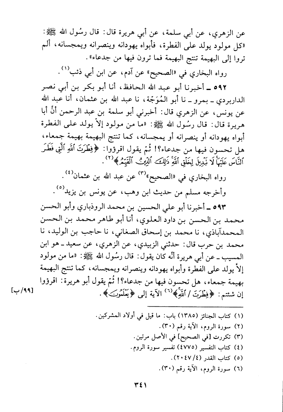 592 - أَخْبَرَنَا أَبُو عَبْدِ اللَّهِ الْحَافِظُ , أنا أَبُو بَكْرِ بْنُ أَبِي نَصْرٍ الدَّارَبِرْدِيُّ , بِمَرْوَ , نا أَبُو الْمُوَجَّهِ , نا عَبْدُ اللَّهِ بْنُ عُثْمَانَ , أنا عَبْدُ اللَّهِ , عَنْ يُونُسَ , عَنِ الزُّهْرِيِّ , قَالَ: أَخْبَرَنِي أَبُو سَلَمَةَ بْنُ عَبْدِ الرَّحْمَنِ , أَنَّ أَبَا هُرَيْرَةَ قَالَ: قَالَ رَسُولُ اللَّهِ صَلَّى اللهُ عَلَيْهِ وَسَلَّمَ: §" مَا مِنْ مَوْلُودٍ إِلَّا يُولَدُ عَلَى الْفِطْرَةِ أَبَوَاهُ يُهَوِّدَانِهِ أَوْ يُنَصِّرَانِهِ أَوْ يُمَجِّسَانِهِ , كَمَا تُنْتِجُ الْبَهِيمَةُ بَهِيمَةً جَمْعَاءَ , هَلْ تَحُسُّونَ فِيهَا مِنْ جَدْعَاءَ؟ ثُمَّ يَقُولُ: اقْرَءُوا: {فِطْرَةَ اللَّهِ الَّتِي فَطَرَ النَّاسَ عَلَيْهَا لَا تَبْدِيلَ لِخَلْقِ اللَّهِ ذَلِكَ الدِّينُ الْقَيِّمُ} [الروم: 30] " رَوَاهُ الْبُخَارِيُّ فِي الصَّحِيحِ عَنْ عَبْدِ اللَّهِ بْنِ عُثْمَانَ وَأَخْرَجَهُ مُسْلِمٌ مِنْ حَدِيثِ ابْنِ وَهْبٍ , عَنْ يُونُسَ بْنِ يَزِيدَ