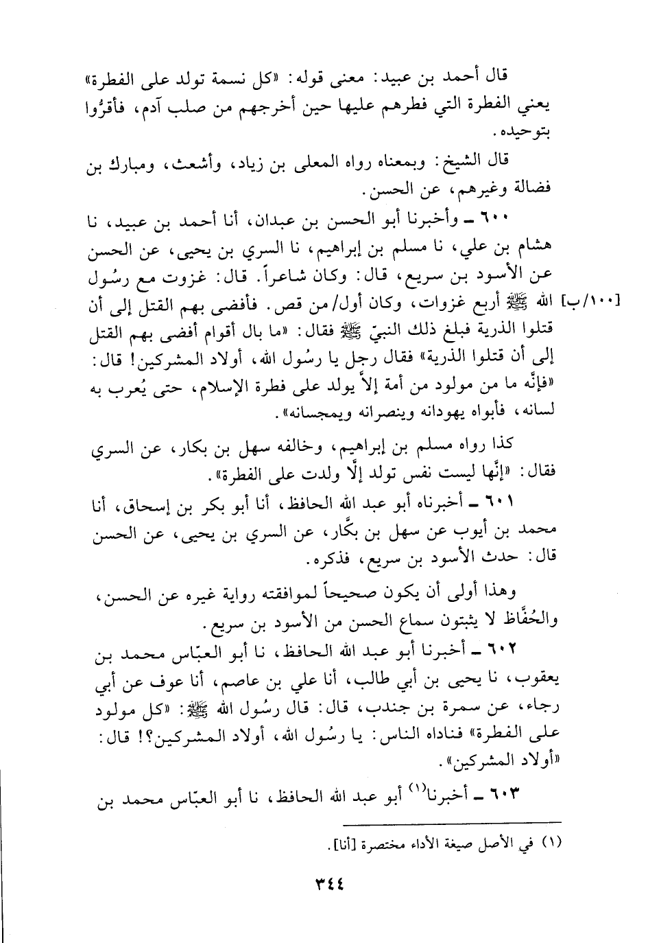 602 - أَخْبَرَنَا أَبُو عَبْدِ اللَّهِ الْحَافِظُ , نا أَبُو الْعَبَّاسِ مُحَمَّدُ بْنُ يَعْقُوبَ , نا يَحْيَى بْنُ أَبِي طَالِبٍ , أنا عَلِيُّ بْنُ عَاصِمٍ , أنا عَوْفٌ، عَنْ أَبِي رَجَاءٍ , عَنْ سَمُرَةَ بْنِ جُنْدُبٍ , قَالَ: قَالَ رَسُولُ اللَّهِ صَلَّى اللهُ عَلَيْهِ وَسَلَّمَ: «§كُلُّ مَوْلُودٍ عَلَى الْفِطْرَةِ» فَنَادَاهُ النَّاسُ: يَا رَسُولَ اللَّهِ , أَوْلَادُ الْمُشْرِكِينَ؟ قَالَ: «أَوْلَادُ الْمُشْرِكِينَ»