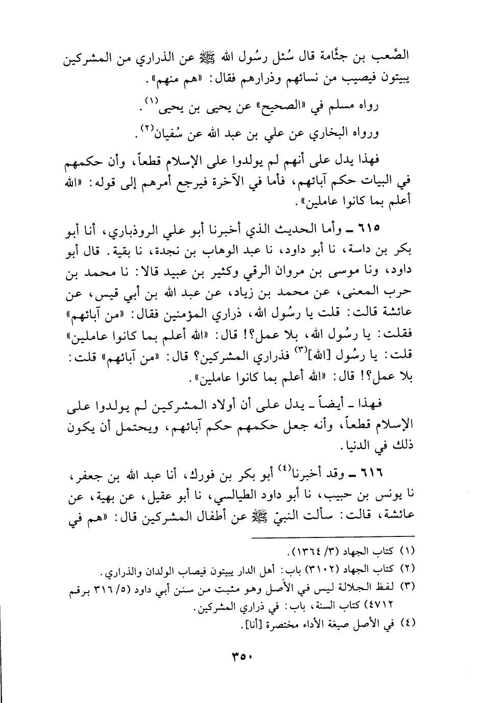 615 - وَأَمَّا الْحَدِيثُ الَّذِي أَخْبَرَنَا أَبُو عَلِيٍّ الرُّوذْبَارِيُّ , أنا أَبُو بَكْرِ بْنُ دَاسَةَ , نا أَبُو دَاوُدَ , نا عَبْدُ الْوَهَّابِ بْنُ نَجْدَةَ , نا بَقِيَّةُ , قَالَ أَبُو دَاوُدَ , ونا مُوسَى بْنُ مَرْوَانَ الرَّقِّيُّ , وَكَثِيرُ بْنُ عُبَيْدٍ , قَالَا: نا مُحَمَّدُ بْنُ حَرْبٍ الْمَعْنَى , عَنْ مُحَمَّدِ بْنِ زِيَادٍ , عَنْ عَبْدِ اللَّهِ بْنِ أَبِي قَيْسٍ , عَنْ عَائِشَةَ , قَالَتْ: قُلْتُ يَا رَسُولَ اللَّهِ زَرَارِيُّ الْمُؤْمِنِينَ فَقَالَ: «مِنْ آبَائِهِمْ» فَقُلْتُ: يَا رَسُولَ اللَّهِ , بِلَا عَمَلٍ؟ قَالَ: «§اللَّهُ أَعْلَمُ بِمَا كَانُوا عَامِلِينَ» قُلْتُ: يَا رَسُولَ اللَّهِ فَذَرَارِيُّ الْمُشْرِكِينَ؟ قَالَ: «مِنْ آبَائِهِمْ» قُلْتُ: بِلَا عَمَلٍ؟ قَالَ: «اللَّهُ أَعْلَمُ بِمَا كَانُوا عَامِلِينَ» فَهَذَا أَيْضًا يَدُلُّ عَلَى أَنَّ أَوْلَادَ الْمُشْرِكِينَ لَمْ يُولَدُوا عَلَى الْإِسْلَامِ قَطْعًا , وَأَنَّهُ جَعَلَ حُكْمَهُمْ حُكْمَ آبَائِهِمْ , وَيُحْتَمَلُ أَنْ يَكُونَ ذَلِكَ فِي الدُّنْيَا