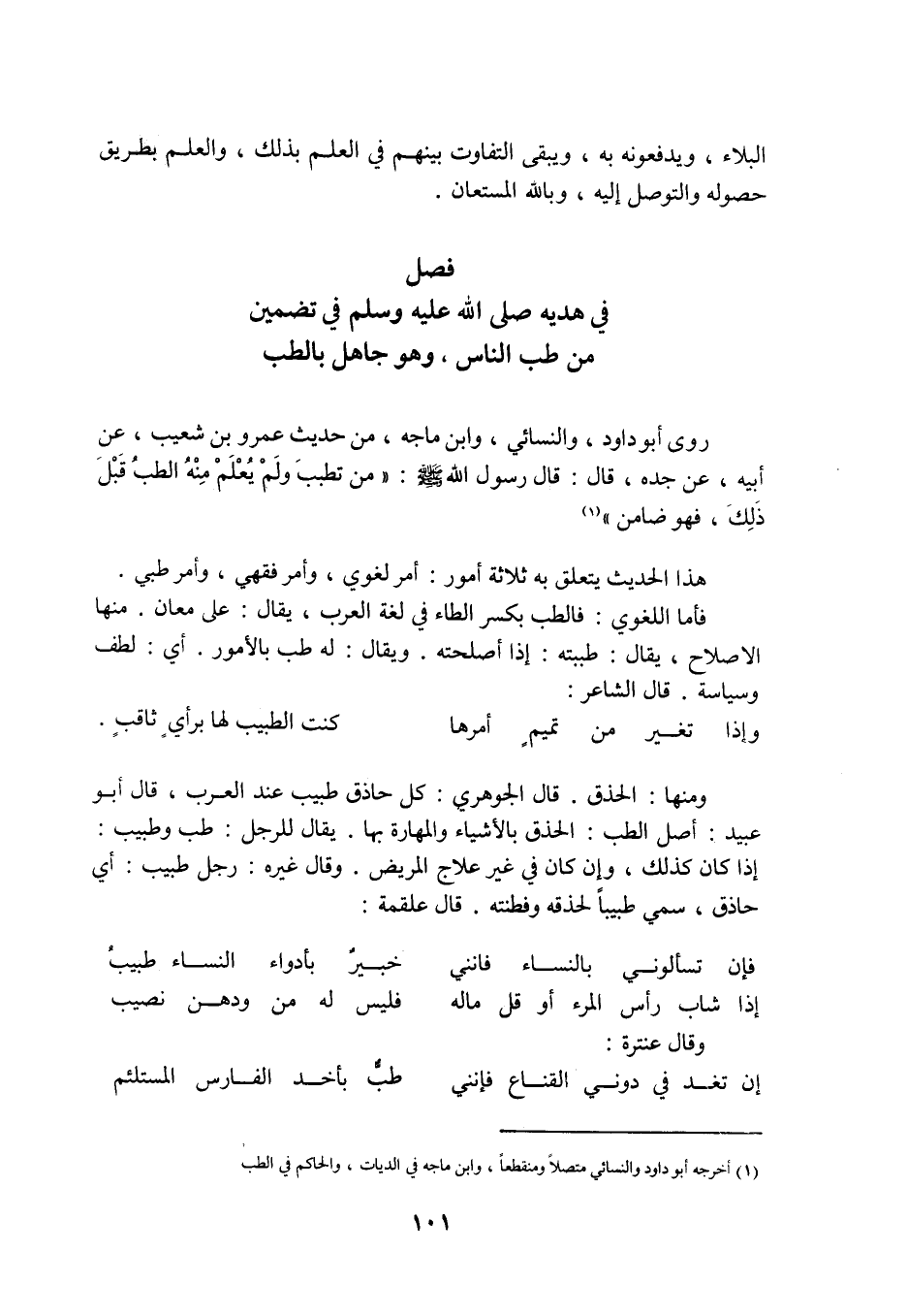 رَوَى أبو داود، وَالنَّسَائِيُّ، وَابْنُ مَاجَهْ، مِنْ حَدِيثِ عَمْرِو بْنِ شُعَيْبٍ، عَنْ أَبِيهِ، عَنْ جَدِّهِ، قَالَ: قَالَ رَسُولُ اللَّهِ صَلَّى اللَّهُ عَلَيْهِ وَسَلَّمَ: «مَنْ تَطَبَّبَ وَلَمْ يُعْلَمْ مِنْهُ الطِّبُّ قَبْلَ ذَلِكَ، فَهُوَ ضَامِنٌ» «1»