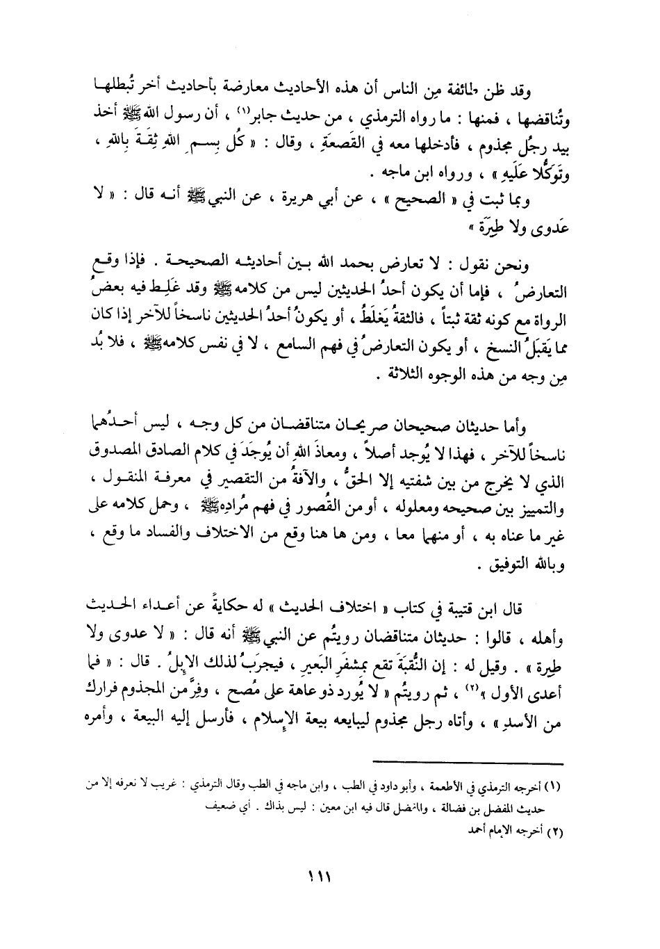 قَالَ ابن قتيبة فِي كِتَابِ «اخْتِلَافِ الْحَدِيثِ» لَهُ حِكَايَةً عَنْ أَعْدَاءِ الْحَدِيثِ وَأَهْلِهِ، قَالُوا: حَدِيثَانِ مُتَنَاقِضَانِ رَوَيْتُمْ عَنِ النَّبِيِّ صَلَّى اللَّهُ عَلَيْهِ وَسَلَّمَ أَنَّهُ قَالَ: «لَا عَدْوَى وَلَا طِيَرَةَ» . وَقِيلَ لَهُ: إِنَّ النُّقْبَةَ تَقَعُ بِمِشْفَرِ الْبَعِيرِ، فَيَجْرَبُ لِذَلِكَ الْإِبِلُ. قَالَ: «فَمَا أَعْدَى الْأَوَّلَ» «2» ، ثُمَّ رَوَيْتُمْ «لَا يُورَدُ ذُو عَاهَةٍ عَلَى مُصِحٍّ، وَفِرَّ مِنَ الْمَجْذُومِ فِرَارَكَ مِنَ الْأَسَدِ» ، وَأَتَاهُ رَجُلٌ مَجْذُومٌ لِيُبَايِعَهُ بَيْعَةَ الإسلام، فأرسل إليه البيعة، وأمره