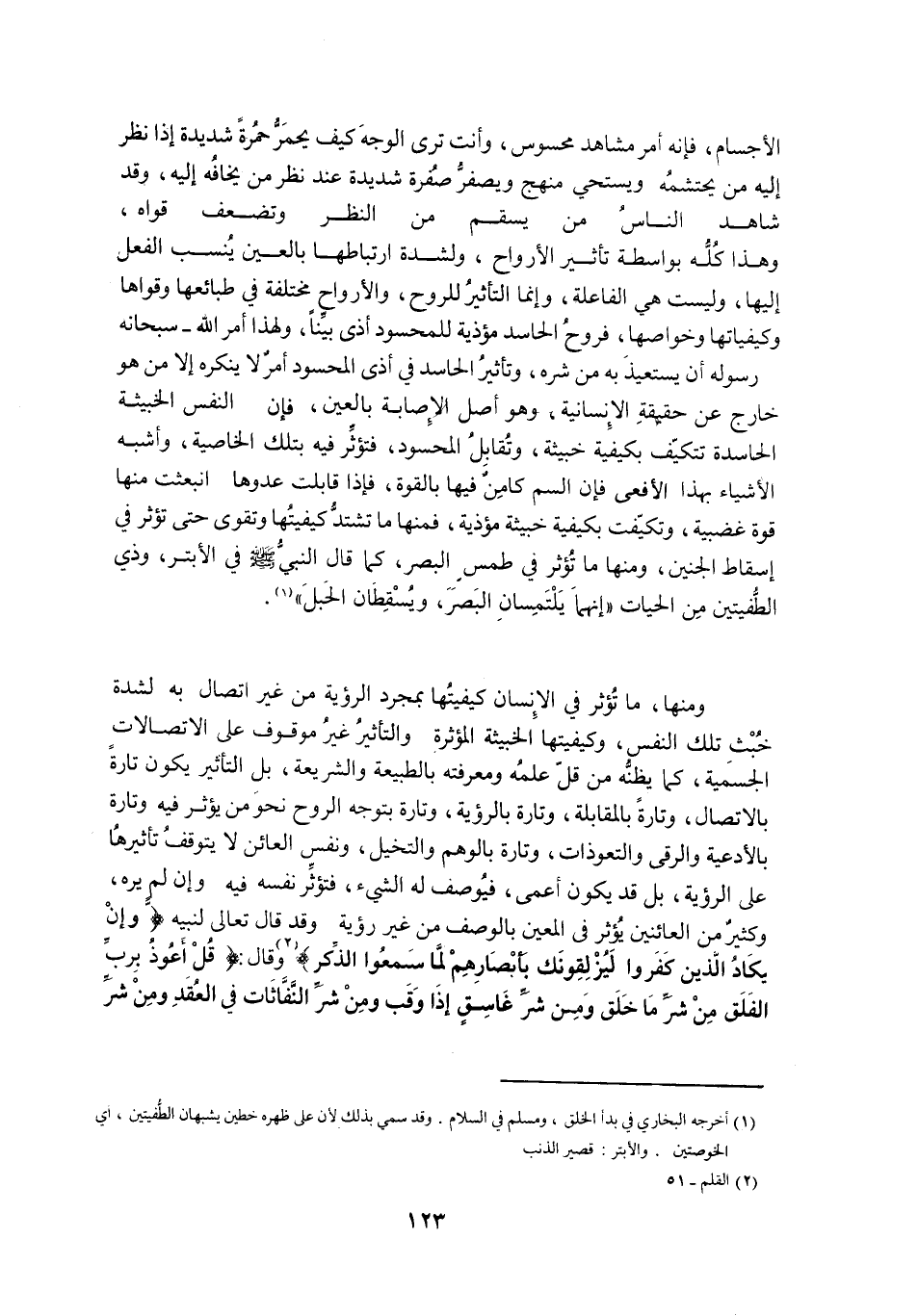 وَمِنْهَا، مَا تُؤَثِّرُ فِي الْإِنْسَانِ كَيْفِيَّتُهَا بِمُجَرَّدِ الرُّؤْيَةِ مِنْ غَيْرِ اتِّصَالٍ بِهِ لِشِدَّةِ خُبْثِ تِلْكَ النَّفْسِ، وَكَيْفِيَّتِهَا الْخَبِيثَةِ الْمُؤَثِّرَةِ وَالتَّأْثِيرُ غَيْرُ مَوْقُوفٍ عَلَى الِاتِّصَالَاتِ الْجِسْمِيَّةِ، كَمَا يَظُنُّهُ مَنْ قَلَّ عِلْمُهُ وَمَعْرِفَتُهُ بِالطَّبِيعَةِ وَالشَّرِيعَةِ، بَلِ التَّأْثِيرُ يَكُونُ تَارَةً بِالِاتِّصَالِ، وَتَارَةً بِالْمُقَابَلَةِ، وَتَارَةً بِالرُّؤْيَةِ، وَتَارَةً بِتَوَجُّهِ الرُّوحِ نَحْوَ مَنْ يُؤَثِّرُ فِيهِ وَتَارَةً بِالْأَدْعِيَةِ وَالرُّقَى وَالتَّعَوُّذَاتِ، وَتَارَةً بِالْوَهْمِ وَالتَّخَيُّلِ، وَنَفْسُ الْعَائِنِ لَا يَتَوَقَّفُ تَأْثِيرُهَا عَلَى الرُّؤْيَةِ، بَلْ قَدْ يَكُونُ أَعْمَى، فَيُوصَفُ لَهُ الشَّيْءُ، فَتُؤَثِّرُ نَفْسُهُ فِيهِ وَإِنْ لَمْ يَرَهُ، وَكَثِيرٌ مِنَ الْعَائِنِينَ يُؤَثِّرُ فِي الْمَعِينِ بِالْوَصْفِ مِنْ غَيْرِ رُؤْيَةٍ وَقَدْ قَالَ تَعَالَى لِنَبِيِّهِ وَإِنْ يَكادُ الَّذِينَ كَفَرُوا لَيُزْلِقُونَكَ بِأَبْصارِهِمْ لَمَّا سَمِعُوا الذِّكْرَ «2» وَقَالَ: قُلْ أَعُوذُ بِرَبِّ الْفَلَقِ مِنْ شَرِّ مَا خَلَقَ وَمِنْ شَرِّ غاسِقٍ إِذا وَقَبَ وَمِنْ شَرِّ النَّفَّاثاتِ فِي الْعُقَدِ وَمِنْ شَرِّ