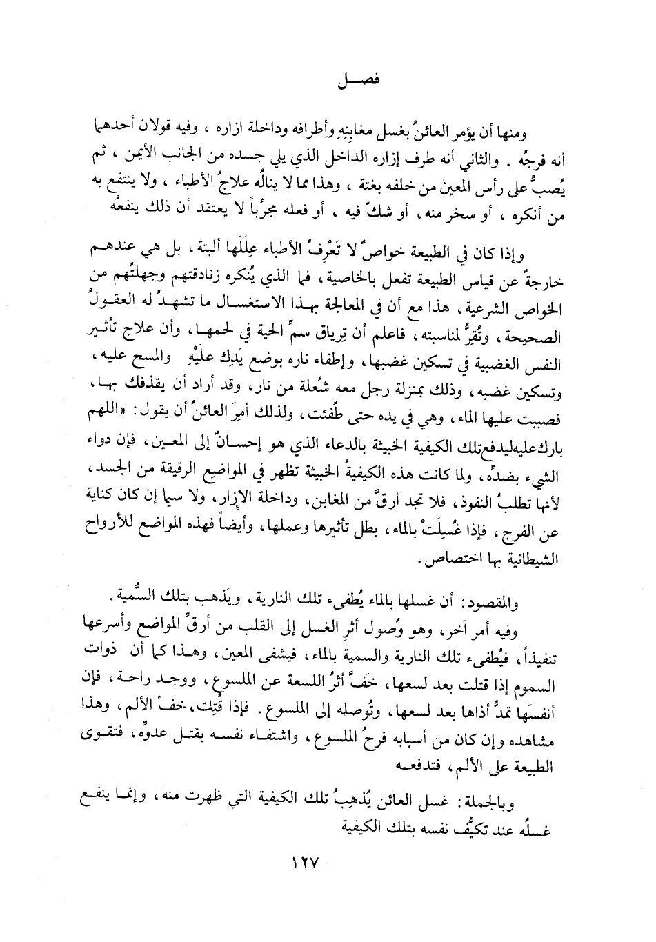وَإِذَا كَانَ فِي الطَّبِيعَةِ خَوَاصُّ لَا تَعْرِفُ الْأَطِبَّاءُ عِلَلَهَا الْبَتَّةَ، بَلْ هِيَ عِنْدَهُمْ خَارِجَةٌ عَنْ قِيَاسِ الطَّبِيعَةِ تَفْعَلُ بِالْخَاصِّيَّةِ، فَمَا الَّذِي يُنْكِرُهُ زَنَادِقَتُهُمْ وَجَهَلَتُهُمْ مِنَ الْخَوَاصِّ الشَّرْعِيَّةِ، هَذَا مَعَ أَنَّ فِي الْمُعَالَجَةِ بِهَذَا الِاسْتِغْسَالِ مَا تَشْهَدُ لَهُ الْعُقُولُ الصَّحِيحَةُ، وَتُقِرُّ لِمُنَاسَبَتِهِ، فَاعْلَمْ أَنَّ تِرْيَاقَ سُمِّ الْحَيَّةِ فِي لَحْمِهَا، وَأَنَّ عِلَاجَ تَأْثِيرِ النَّفْسِ الْغَضَبِيَّةِ فِي تَسْكِينِ غَضَبِهَا، وَإِطْفَاءِ نَارِهِ بِوَضْعِ يَدِكَ عَلَيْهِ وَالْمَسْحِ عَلَيْهِ، وَتَسْكِينِ غَضَبِهِ، وَذَلِكَ بِمَنْزِلَةِ رَجُلٍ مَعَهُ شُعْلَةٌ مِنْ نَارٍ، وَقَدْ أَرَادَ أَنْ يَقْذِفَكَ بِهَا، فَصَبَبْتَ عَلَيْهَا الْمَاءَ، وَهِيَ فِي يَدِهِ حَتَّى طُفِئَتْ، وَلِذَلِكَ أُمِرَ الْعَائِنُ أَنْ يَقُولَ: «اللَّهُمَّ بَارِكْ عَلَيْهِ لِيَدْفَعَ تِلْكَ الْكَيْفِيَّةَ الْخَبِيثَةَ بِالدُّعَاءِ الَّذِي هُوَ إِحْسَانٌ إِلَى الْمَعِينِ، فَإِنَّ دَوَاءَ الشَّيْءِ بِضِدِّهِ، وَلَمَّا كَانَتْ هَذِهِ الْكَيْفِيَّةُ الْخَبِيثَةُ تَظْهَرُ فِي الْمَوَاضِعِ الرَّقِيقَةِ مِنَ الْجَسَدِ، لِأَنَّهَا تَطْلُبُ النُّفُوذَ، فَلَا تَجِدُ أَرَقَّ مِنَ الْمَغَابِنِ، وَدَاخِلَةِ الْإِزَارِ، وَلَا سِيَّمَا إِنْ كَانَ كِنَايَةً عَنِ الْفَرَجِ، فَإِذَا غُسِلَتْ بِالْمَاءِ، بَطَلَ تَأْثِيرُهَا وَعَمَلُهَا، وَأَيْضًا فَهَذِهِ الْمَوَاضِعُ لِلْأَرْوَاحِ الشَّيْطَانِيَّةِ بِهَا اخْتِصَاصٌ.