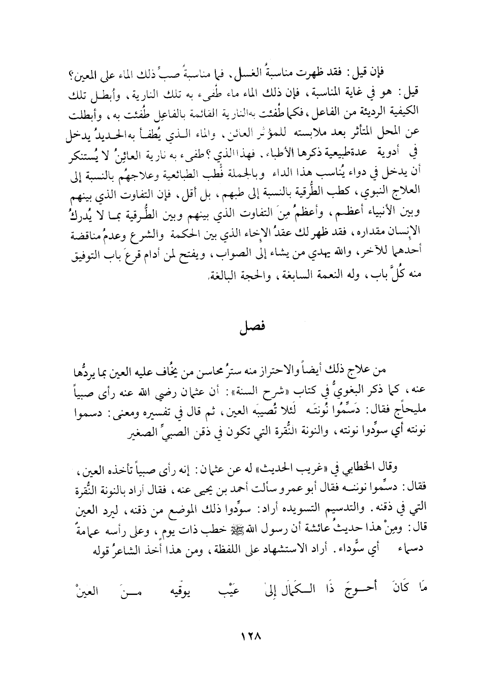 قِيلَ: هُوَ فِي غَايَةِ الْمُنَاسَبَةِ، فَإِنَّ ذَلِكَ الْمَاءَ ماء طفىء بِهِ تِلْكَ النَّارِيَّةُ، وَأَبْطَلَ تِلْكَ الْكَيْفِيَّةَ الرَّدِيئَةَ مِنَ الْفَاعِلِ، فَكَمَا طُفِئَتْ بِهِ النَّارِيَّةُ الْقَائِمَةُ بِالْفَاعِلِ طُفِئَتْ بِهِ، وَأُبْطِلَتْ عَنِ الْمَحَلِّ الْمُتَأَثِّرِ بَعْدَ مُلَابَسَتِهِ لِلْمُؤَثِّرِ الْعَائِنِ، وَالْمَاءُ الَّذِي يُطْفَأُ بِهِ الْحَدِيدُ يَدْخُلُ فِي أَدْوِيَةٍ عِدَّةٍ طَبِيعِيَّةٍ ذكرها الأطباء، فهذا الذي؟ طفىء بِهِ نَارِيَّةُ الْعَائِنِ لَا يُسْتَنْكَرُ أَنْ يَدْخُلَ فِي دَوَاءٍ يُنَاسِبُ هَذَا الدَّاءَ وَبِالْجُمْلَةِ فَطِبُّ الطَّبَائِعِيَّةِ وَعِلَاجُهُمْ بِالنِّسْبَةِ إِلَى الْعِلَاجِ النَّبَوِيِّ، كَطِبِّ الطُّرُقِيَّةِ بِالنِّسْبَةِ إِلَى طِبِّهِمْ، بَلْ أَقَلُّ، فَإِنَّ التَّفَاوُتَ الَّذِي بَيْنَهُمْ وَبَيْنَ الْأَنْبِيَاءِ أَعْظَمُ، وَأَعْظَمُ مِنَ التَّفَاوُتِ الَّذِي بَيْنَهُمْ وَبَيْنَ الطُّرُقِيَّةِ بِمَا لَا يُدْرِكُ الْإِنْسَانُ مِقْدَارَهُ، فَقَدْ ظَهَرَ لَكَ عَقْدُ الْإِخَاءِ الَّذِي بَيْنَ الْحِكْمَةِ وَالشَّرْعِ وَعَدَمُ مُنَاقَضَةِ أَحَدِهِمَا لِلْآخَرِ، وَاللَّهُ يَهْدِي مَنْ يَشَاءُ إِلَى الصَّوَابِ، وَيَفْتَحُ لِمَنْ أَدَامَ قَرْعَ بَابِ التَّوْفِيقِ مِنْهُ كُلَّ بَابٍ، وَلَهُ النِّعْمَةُ السَّابِغَةُ، والحجة البالغة.