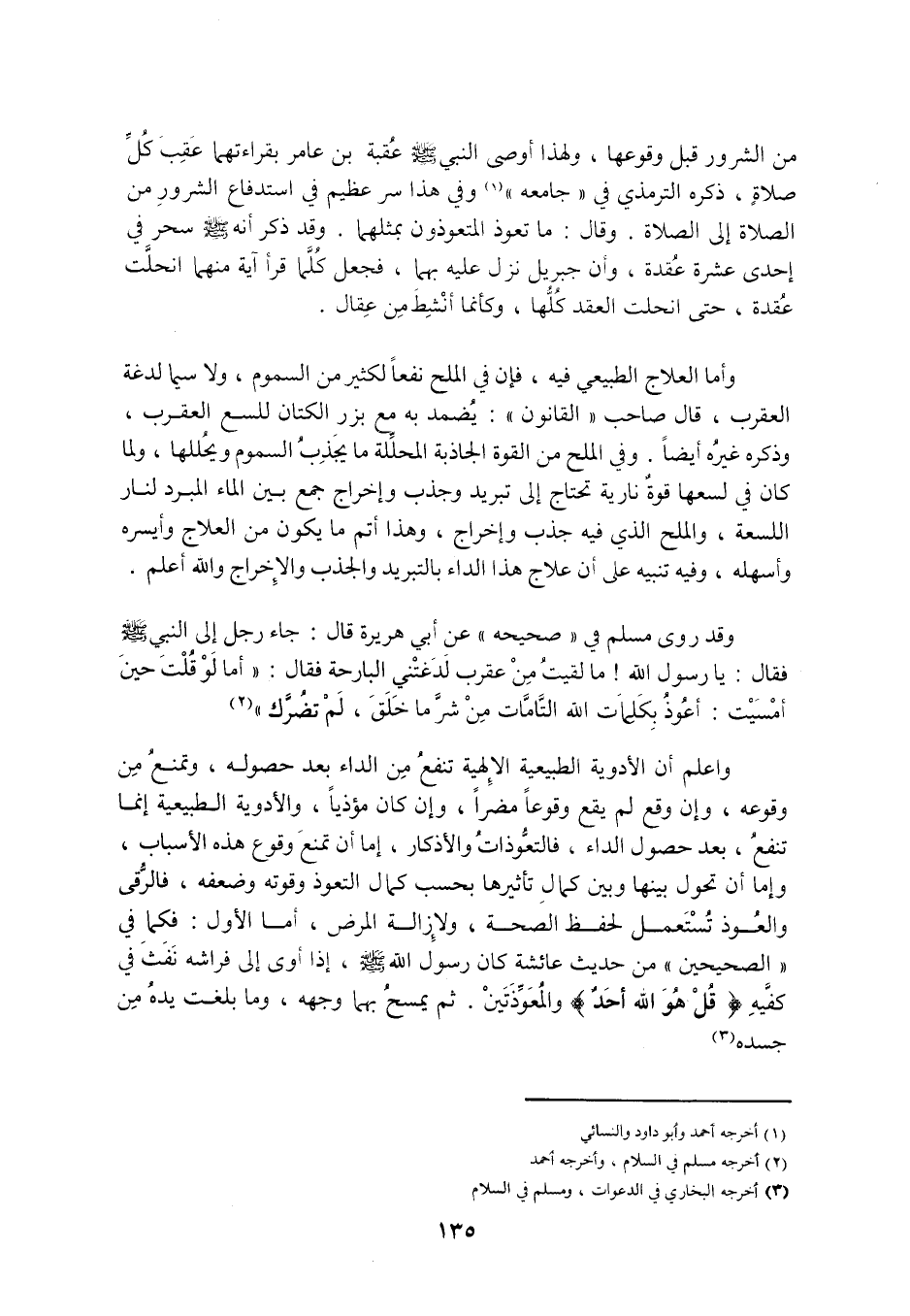 وَقَدْ رَوَى مسلم فِي «صَحِيحِهِ» عَنْ أَبِي هُرَيْرَةَ قَالَ: جَاءَ رَجُلٌ إِلَى النَّبِيِّ صَلَّى اللَّهُ عَلَيْهِ وَسَلَّمَ فَقَالَ: يَا رَسُولَ اللَّهِ! مَا لَقِيتُ مِنْ عَقْرَبٍ لَدَغَتْنِي الْبَارِحَةَ فَقَالَ: «أَمَا لَوْ قُلْتَ حِينَ أَمْسَيْتَ: أَعُوذُ بِكَلِمَاتِ اللَّهِ التَّامَّاتِ مِنْ شَرِّ مَا خَلَقَ، لَمْ تَضُرَّكَ» «2»
