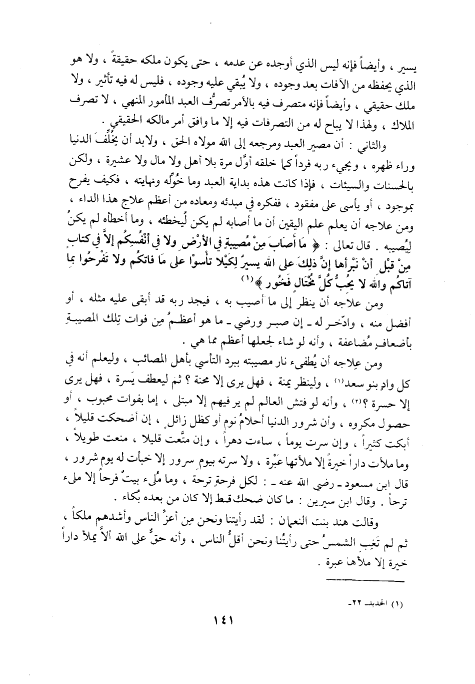 وَالثَّانِي: أَنَّ مَصِيرَ الْعَبْدِ وَمَرْجِعَهُ إِلَى اللَّهِ مَوْلَاهُ الْحَقِّ، وَلَا بُدَّ أَنْ يُخَلِّفَ الدُّنْيَا وَرَاءَ ظَهْرِهِ، وَيَجِيءَ رَبَّهُ فَرْدًا كَمَا خَلَقَهُ أَوَّلَ مَرَّةٍ بِلَا أَهْلٍ وَلَا مَالٍ وَلَا عَشِيرَةٍ، وَلَكِنْ بِالْحَسَنَاتِ وَالسَّيِّئَاتِ، فَإِذَا كَانَتْ هَذِهِ بِدَايَةَ الْعَبْدِ وَمَا خُوِّلَهُ وَنِهَايَتَهُ، فَكَيْفَ يَفْرَحُ بِمَوْجُودٍ، أَوْ يَأْسَى عَلَى مَفْقُودٍ، فَفِكْرُهُ فِي مَبْدَئِهِ وَمَعَادِهِ مِنْ أَعْظَمِ عِلَاجِ هَذَا الدَّاءِ، وَمِنْ عِلَاجِهِ أَنْ يَعْلَمَ عِلْمَ الْيَقِينِ أَنَّ مَا أَصَابَهُ لَمْ يَكُنْ لِيُخْطِئَهُ، وَمَا أَخْطَأَهُ لَمْ يَكُنْ لِيُصِيبَهُ. قَالَ تَعَالَى: مَا أَصابَ مِنْ مُصِيبَةٍ فِي الْأَرْضِ وَلا فِي أَنْفُسِكُمْ إِلَّا فِي كِتابٍ مِنْ قَبْلِ أَنْ نَبْرَأَها إِنَّ ذلِكَ عَلَى اللَّهِ يَسِيرٌ لِكَيْلا تَأْسَوْا عَلى مَا فاتَكُمْ وَلا تَفْرَحُوا بِما آتاكُمْ وَاللَّهُ لَا يُحِبُّ كُلَّ مُخْتالٍ فَخُورٍ «1»