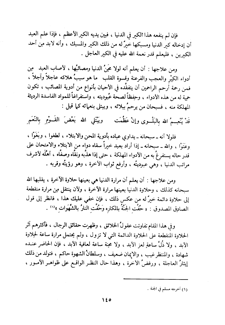 وَمِنْ عِلَاجِهَا: أَنْ يَعْلَمَ أَنَّ مَرَارَةَ الدُّنْيَا هِيَ بِعَيْنِهَا حَلَاوَةُ الْآخِرَةِ، يَقْلِبُهَا اللَّهُ سُبْحَانَهُ كَذَلِكَ، وَحَلَاوَةَ الدُّنْيَا بِعَيْنِهَا مَرَارَةُ الْآخِرَةِ، وَلَأَنْ يَنْتَقِلَ مِنْ مَرَارَةٍ مُنْقَطِعَةٍ إِلَى حَلَاوَةٍ دَائِمَةٍ خَيْرٌ لَهُ مِنْ عَكْسِ ذَلِكَ، فَإِنْ خَفِيَ عَلَيْكَ هَذَا، فَانْظُرْ إِلَى قَوْلِ الصَّادِقِ الْمَصْدُوقِ: «حُفَّتِ الْجَنَّةُ بِالْمَكَارِهِ وَحُفَّتِ النَّارُ بِالشَّهَوَاتِ» » .