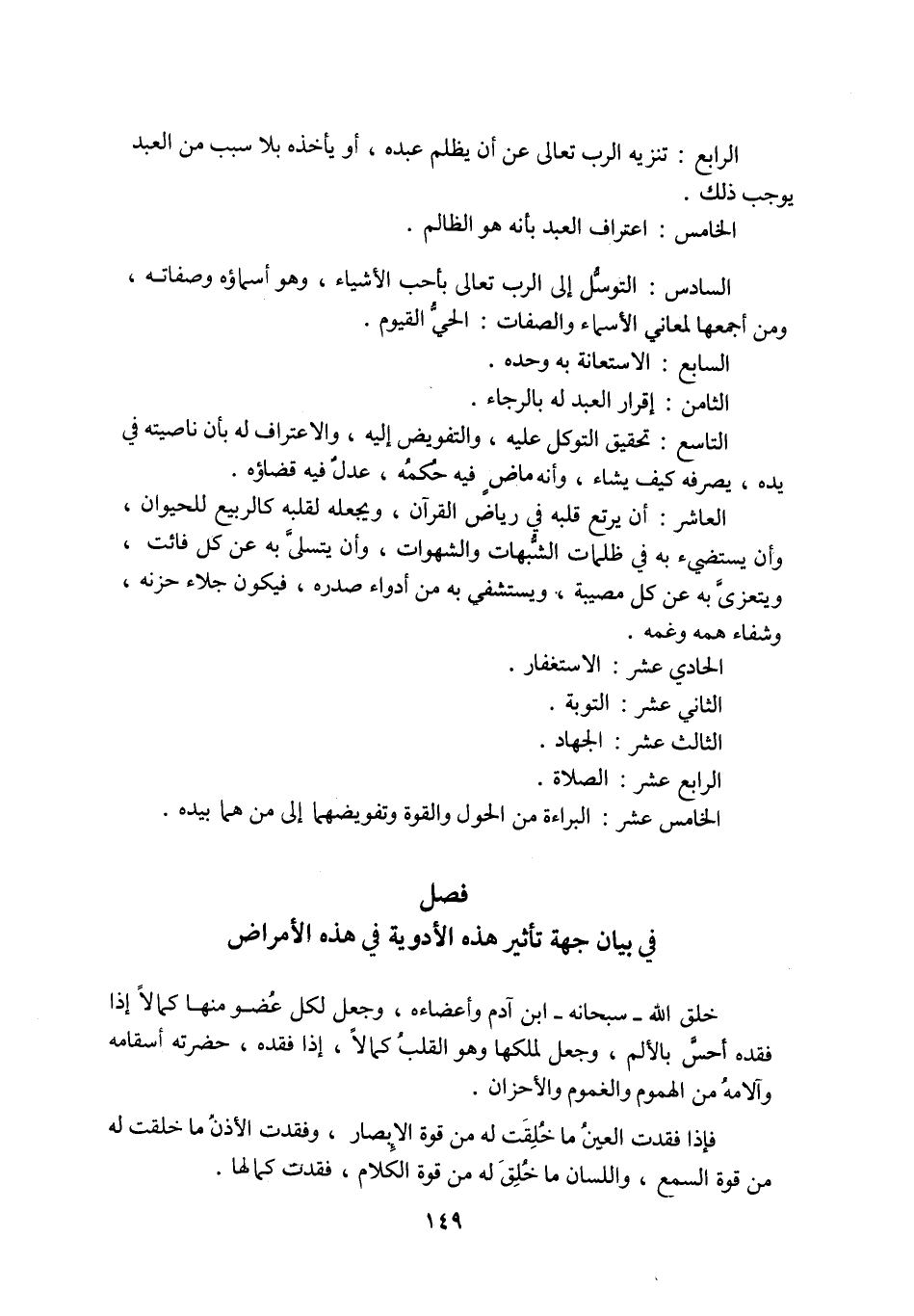 خَلَقَ اللَّهُ- سُبْحَانَهُ- ابْنَ آدَمَ وَأَعْضَاءَهُ، وَجَعَلَ لِكُلِّ عُضْوٍ مِنْهَا كَمَالًا إِذَا فَقَدَهُ أَحَسَّ بِالْأَلَمِ، وَجَعَلَ لِمَلِكِهَا وَهُوَ الْقَلْبُ كَمَالًا، إِذَا فَقَدَهُ، حَضَرَتْهُ أَسْقَامُهُ وَآلَامُهُ مِنَ الْهُمُومِ وَالْغُمُومِ وَالْأَحْزَانِ.