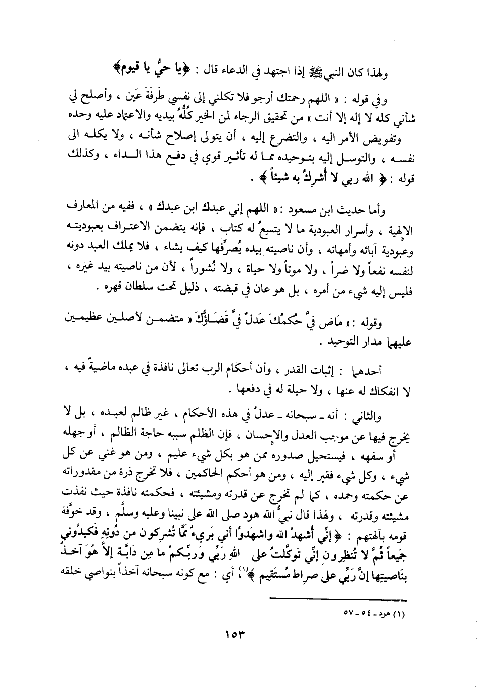 وَالثَّانِي: أَنَّهُ- سُبْحَانَهُ- عَدْلٌ فِي هَذِهِ الْأَحْكَامِ، غَيْرُ ظَالِمٍ لِعَبْدِهِ، بَلْ لَا يَخْرُجُ فِيهَا عَنْ مُوجَبِ الْعَدْلِ وَالْإِحْسَانِ، فَإِنَّ الظُّلْمَ سَبَبُهُ حَاجَةُ الظَّالِمِ، أَوْ جَهْلُهُ أَوْ سَفَهُهُ، فَيَسْتَحِيلُ صُدُورُهُ مِمَّنْ هُوَ بِكُلِّ شَيْءٍ عَلِيمٌ، وَمَنْ هُوَ غَنِيٌّ عَنْ كُلِّ شَيْءٍ، وَكُلُّ شَيْءٍ فَقِيرٌ إِلَيْهِ، وَمَنْ هُوَ أَحْكَمُ الْحَاكِمِينَ، فَلَا تَخْرُجُ ذَرَّةٌ مِنْ مَقْدُورَاتِهِ عَنْ حِكْمَتِهِ وَحَمْدِهِ، كَمَا لَمْ تَخْرُجْ عَنْ قُدْرَتِهِ وَمَشِيئَتِهِ، فَحِكْمَتُهُ نَافِذَةٌ حَيْثُ نَفَذَتْ مَشِيئَتُهُ وَقُدْرَتُهُ، وَلِهَذَا قَالَ نَبِيُّ اللَّهِ هُودٌ صَلَّى اللَّهُ عَلَى نَبِيِّنَا وَعَلَيْهِ وَسَلَّمَ، وَقَدْ خَوَّفَهُ قَوْمُهُ بِآلِهَتِهِمْ: إِنِّي أُشْهِدُ اللَّهَ وَاشْهَدُوا أَنِّي بَرِيءٌ مِمَّا تُشْرِكُونَ مِنْ دُونِهِ فَكِيدُونِي جَمِيعاً ثُمَّ لا تُنْظِرُونِ إِنِّي تَوَكَّلْتُ عَلَى اللَّهِ رَبِّي وَرَبِّكُمْ مَا مِنْ دَابَّةٍ إِلَّا هُوَ آخِذٌ بِناصِيَتِها إِنَّ رَبِّي عَلى صِراطٍ مُسْتَقِيمٍ «1» ، أَيْ: مَعَ كَوْنِهِ سُبْحَانَهُ آخِذًا بِنَوَاصِي خَلْقِهِ