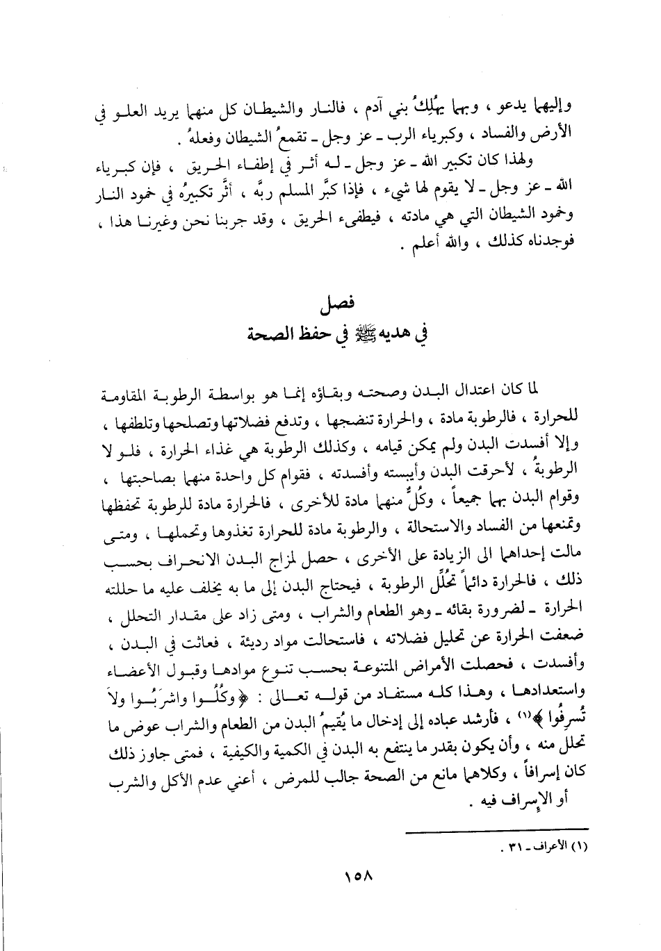 لَمَّا كَانَ اعْتِدَالُ الْبَدَنِ وَصِحَّتُهُ وَبَقَاؤُهُ إِنَّمَا هُوَ بِوَاسِطَةِ الرُّطُوبَةِ الْمُقَاوِمَةِ للحرارة، فالرطوبة مادة، وَالْحَرَارَةُ تُنْضِجُهَا، وَتَدْفَعُ فَضَلَاتِهَا وَتُصْلِحُهَا وَتُلَطِّفُهَا، وَإِلَّا أَفْسَدَتِ الْبَدَنَ وَلَمْ يُمْكِنْ قِيَامُهُ، وَكَذَلِكَ الرُّطُوبَةُ هِيَ غِذَاءُ الْحَرَارَةِ، فَلَوْلَا الرُّطُوبَةُ، لَأَحْرَقَتِ الْبَدَنَ وَأَيْبَسَتْهُ وَأَفْسَدَتْهُ، فَقِوَامُ كُلِّ وَاحِدَةٍ مِنْهُمَا بِصَاحِبَتِهَا، وَقِوَامُ الْبَدَنِ بِهِمَا جَمِيعًا، وَكُلٌّ مِنْهُمَا مَادَّةٌ لِلْأُخْرَى، فَالْحَرَارَةُ مَادَّةٌ لِلرُّطُوبَةِ تَحْفَظُهَا وَتَمْنَعُهَا مِنَ الْفَسَادِ وَالِاسْتِحَالَةِ، وَالرُّطُوبَةُ مَادَّةٌ لِلْحَرَارَةِ تَغْذُوهَا وَتَحْمِلُهَا، وَمَتَى مَالَتِ احْدَاهُمَا إِلَى الزِّيَادَةِ عَلَى الْأُخْرَى، حَصَلَ لِمِزَاجِ الْبَدَنِ الِانْحِرَافُ بِحَسَبِ ذَلِكَ، فَالْحَرَارَةُ دَائِمًا تُحَلِّلُ الرُّطُوبَةَ، فَيَحْتَاجُ الْبَدَنُ إِلَى مَا بِهِ يُخْلَفُ عَلَيْهِ مَا حَلَّلَتْهُ الْحَرَارَةُ- لِضَرُورَةِ بَقَائِهِ- وَهُوَ الطَّعَامُ وَالشَّرَابُ، وَمَتَى زَادَ عَلَى مِقْدَارِ التَّحَلُّلِ، ضَعُفَتِ الْحَرَارَةُ عَنْ تَحْلِيلِ فَضَلَاتِهِ، فَاسْتَحَالَتْ مَوَادَّ رَدِيئَةً، فَعَاثَتْ فِي الْبَدَنِ، وَأَفْسَدَتْ، فَحَصَلَتِ الْأَمْرَاضُ الْمُتَنَوِّعَةُ بِحَسَبِ تَنَوُّعِ مَوَادِّهَا وَقَبُولِ الْأَعْضَاءِ وَاسْتِعْدَادِهَا، وَهَذَا كُلُّهُ مُسْتَفَادٌ مِنْ قَوْلِهِ تعالى: وَكُلُوا وَاشْرَبُوا وَلا تُسْرِفُوا «1» ، فَأَرْشَدَ عِبَادَهُ إِلَى إِدْخَالِ مَا يُقِيمُ الْبَدَنَ مِنَ الطَّعَامِ وَالشَّرَابِ عِوَضَ مَا تَحَلَّلَ مِنْهُ، وَأَنْ يَكُونَ بِقَدْرِ مَا يَنْتَفِعُ بِهِ الْبَدَنُ فِي الْكَمِّيَّةِ وَالْكَيْفِيَّةِ، فَمَتَى جَاوَزَ ذَلِكَ كَانَ إِسْرَافًا، وَكِلَاهُمَا مَانِعٌ مِنَ الصِّحَّةِ جَالِبٌ لِلْمَرَضِ، أَعْنِي عَدَمَ الْأَكْلِ وَالشُّرْبِ أَوِ الْإِسْرَافَ فِيهِ.