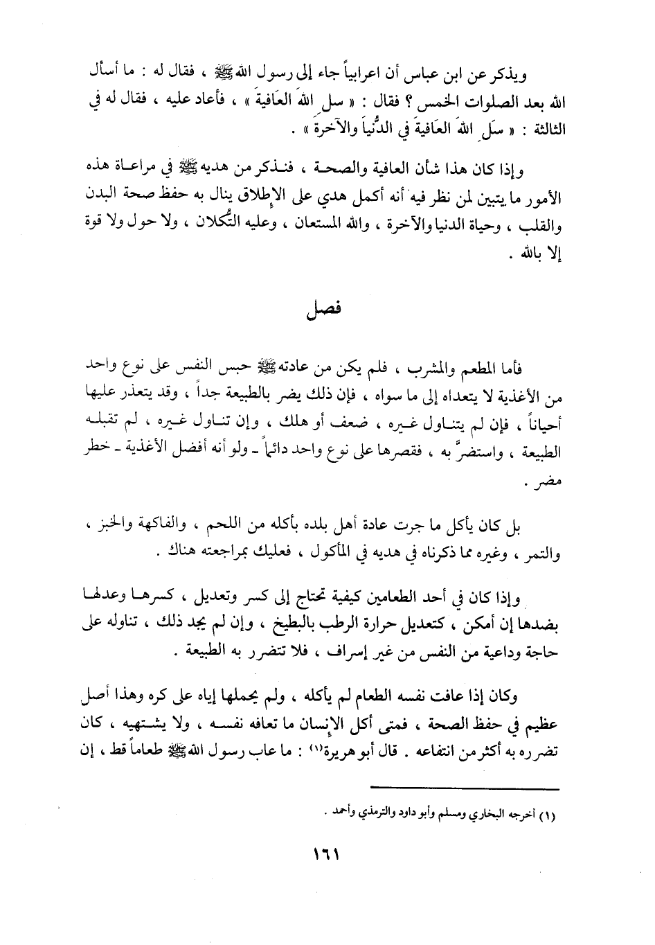 فَأَمَّا الْمَطْعَمُ وَالْمَشْرَبُ، فَلَمْ يَكُنْ مِنْ عَادَتِهِ صَلَّى اللَّهُ عَلَيْهِ وَسَلَّمَ حَبْسُ النَّفْسِ عَلَى نَوْعٍ وَاحِدٍ مِنَ الْأَغْذِيَةِ لَا يَتَعَدَّاهُ إِلَى مَا سِوَاهُ، فَإِنَّ ذَلِكَ يَضُرُّ بِالطَّبِيعَةِ جِدًّا، وَقَدْ يَتَعَذَّرُ عَلَيْهَا أَحْيَانًا، فَإِنْ لَمْ يَتَنَاوَلْ غَيْرَهُ، ضَعُفَ أَوْ هَلَكَ، وَإِنْ تَنَاوَلَ غَيْرَهُ، لَمْ تَقْبَلْهُ الطَّبِيعَةُ، وَاسْتَضَرَّ بِهِ، فَقَصَرَهَا عَلَى نَوْعٍ وَاحِدٍ دَائِمًا- وَلَوْ أَنَّهُ أَفْضَلُ الْأَغْذِيَةِ- خَطَرٌ مُضِرٌّ.