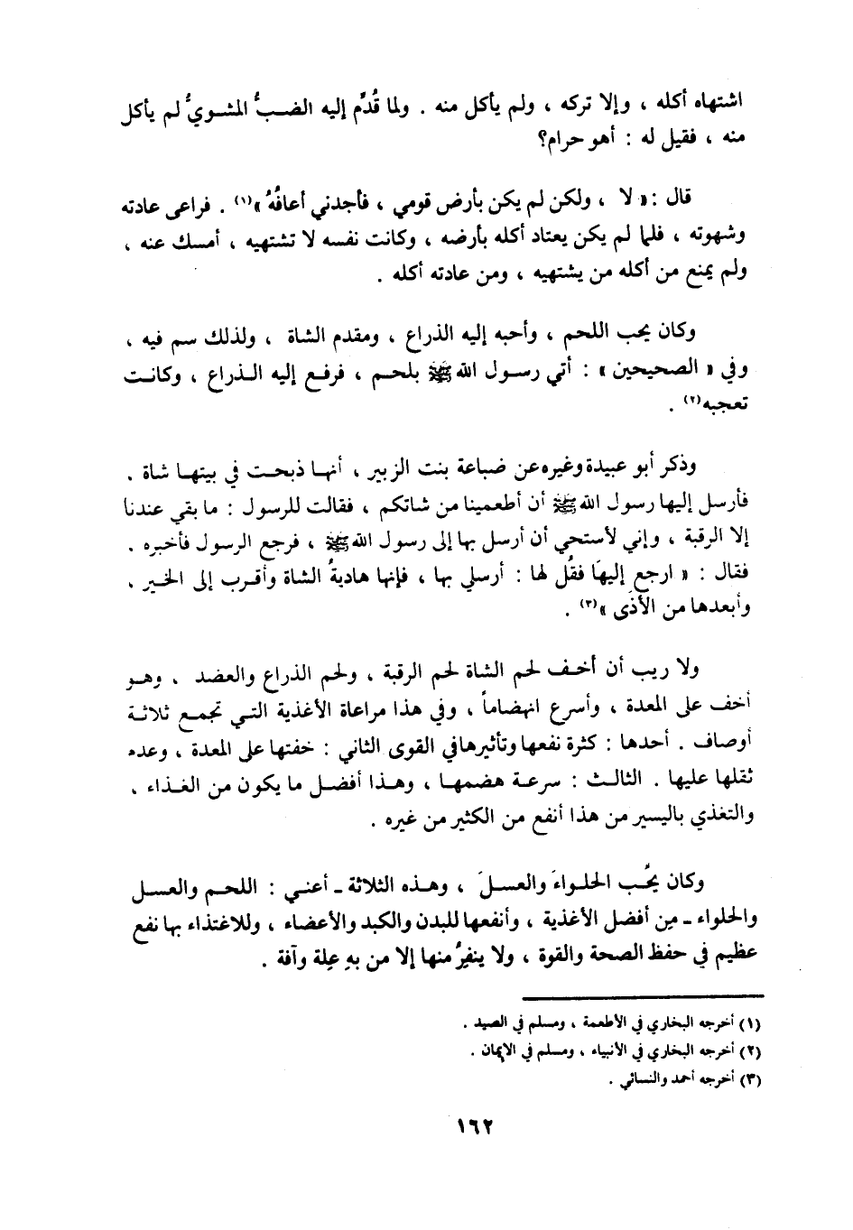 وَلَا رَيْبَ أَنَّ أَخَفَّ لَحْمِ الشَّاةِ لَحْمُ الرَّقَبَةِ، وَلَحْمُ الذِّرَاعِ وَالْعَضُدِ، وَهُوَ أَخَفُّ عَلَى الْمَعِدَةِ، وَأَسْرَعُ انْهِضَامًا، وَفِي هَذَا مُرَاعَاةُ الْأَغْذِيَةِ الَّتِي تَجْمَعُ ثَلَاثَةَ أَوْصَافٍ. أَحَدُهَا: كَثْرَةُ نَفْعِهَا وَتَأْثِيرِهَا فِي الْقُوَى الثَّانِي: خِفَّتُهَا عَلَى الْمَعِدَةِ، وَعَدَمُ ثِقَلِهَا عَلَيْهَا. الثَّالِثُ: سُرْعَةُ هَضْمِهَا، وَهَذَا أَفْضَلُ مَا يَكُونُ مِنَ الْغِذَاءِ، وَالتَّغَذِّي بِالْيَسِيرِ مِنْ هَذَا أَنْفَعُ مِنَ الْكَثِيرِ مِنْ غَيْرِهِ.