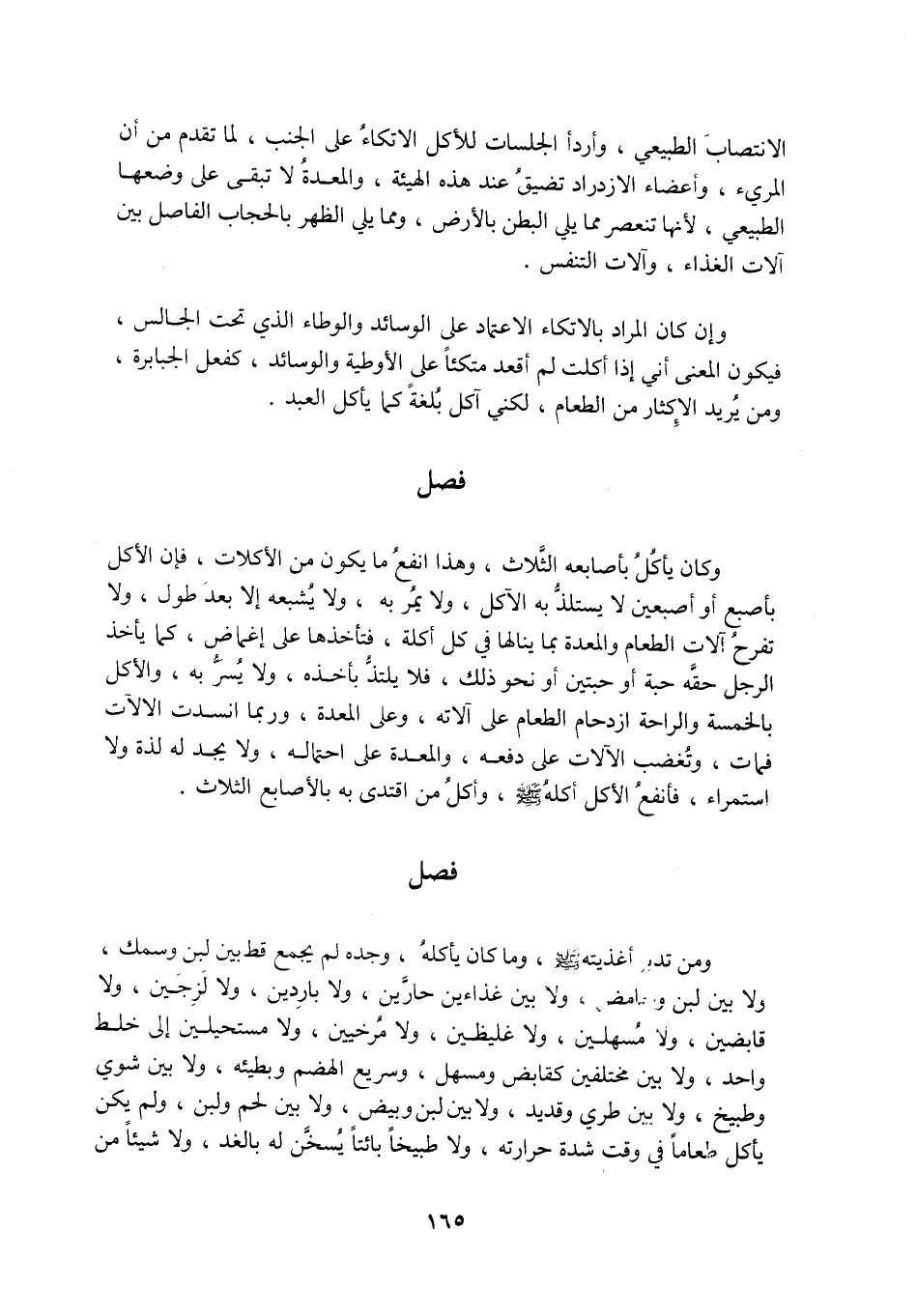 وَمَنْ تَدَبَّرَ؟؟؟ أَغْذِيَتَهُ صَلَّى اللَّهُ عَلَيْهِ وَسَلَّمَ، وَمَا كَانَ يَأْكُلُهُ، وَجَدَهُ لَمْ يَجْمَعْ قَطُّ بَيْنَ لَبَنٍ وَسَمَكٍ، وَلَا بَيْنَ لَبَنٍ وَحَامِضٍ، وَلَا بَيْنَ غِذَاءَيْنِ حَارَّيْنِ، وَلَا بَارِدَيْنِ، وَلَا لَزِجَيْنِ، وَلَا قَابِضَيْنِ، وَلَا مُسْهِلَيْنِ، وَلَا غَلِيظَيْنِ، وَلَا مُرْخِيَيْنِ، وَلَا مُسْتَحِيلَيْنِ إِلَى خَلْطٍ وَاحِدٍ، وَلَا بَيْنَ مُخْتَلِفَيْنِ كَقَابِضٍ وَمُسْهِلٍ، وَسَرِيعِ الْهَضْمِ وَبَطِيئِهِ، وَلَا بَيْنَ شَوِيٍّ وَطَبِيخٍ، وَلَا بَيْنَ طَرِيٍّ وَقَدِيدٍ، وَلَا بَيْنَ لَبَنٍ وَبَيْضٍ، وَلَا بَيْنَ لَحْمٍ وَلَبَنٍ، وَلَمْ يَكُنْ يَأْكُلُ طَعَامًا فِي وَقْتِ شِدَّةِ حَرَارَتِهِ، وَلَا طَبِيخًا بَائِتًا يُسَخَّنُ لَهُ بِالْغَدِ، وَلَا شَيْئًا مِنَ