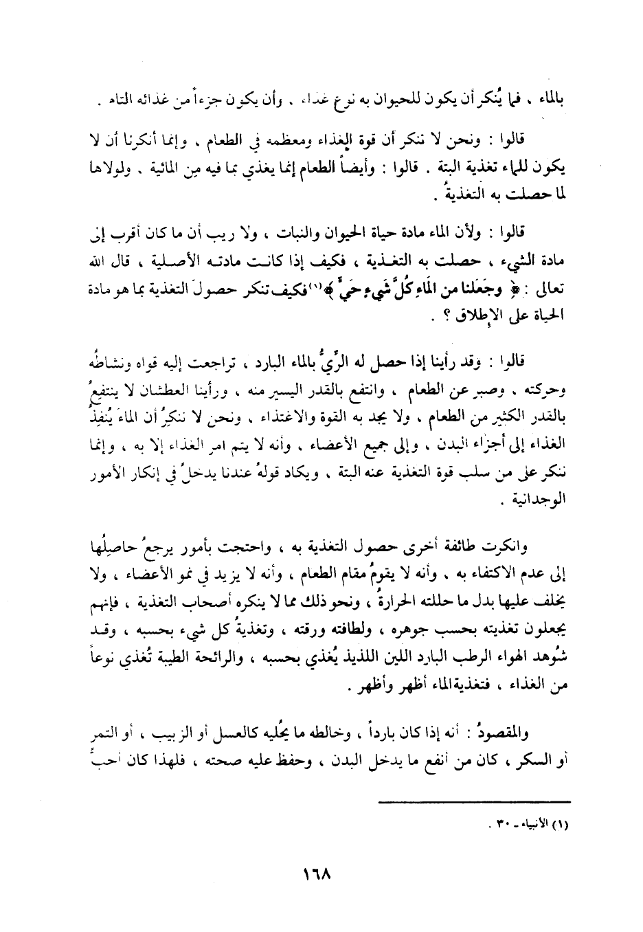 قَالُوا: وَلِأَنَّ الْمَاءَ مَادَّةُ حَيَاةِ الْحَيَوَانِ وَالنَّبَاتِ، وَلَا رَيْبَ أَنَّ مَا كَانَ أَقْرَبَ إِلَى مَادَّةِ الشَّيْءِ، حَصَلَتْ بِهِ التَّغْذِيَةُ، فَكَيْفَ إِذَا كَانَتْ مَادَّتَهُ الْأَصْلِيَّةَ، قَالَ اللَّهُ تَعَالَى: وَجَعَلْنا مِنَ الْماءِ كُلَّ شَيْءٍ حَيٍّ «1» فكيف تنكر حُصُولَ التَّغْذِيَةِ بِمَا هُوَ مَادَّةُ الْحَيَاةِ عَلَى الإطلاق؟.