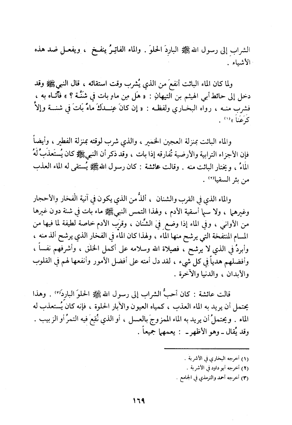 وَالْمَاءُ الَّذِي فِي الْقِرَبِ وَالشِّنَانِ، أَلَذُّ مِنَ الَّذِي يَكُونُ فِي آنِيَةِ الْفَخَّارِ وَالْأَحْجَارِ وَغَيْرِهِمَا، وَلَا سِيَّمَا أَسْقِيَةُ الْأَدَمِ، وَلِهَذَا الْتَمَسَ النَّبِيُّ صَلَّى اللَّهُ عَلَيْهِ وَسَلَّمَ مَاءً بَاتَ فِي شتة دُونَ غَيْرِهَا مِنَ الْأَوَانِي، وَفِي الْمَاءِ إِذَا وُضِعَ فِي الشِّنَانِ، وَقِرَبِ الْأَدَمِ خَاصَّةٌ لَطِيفَةٌ لما فيها من المسام المنتفخة الَّتِي يَرْشَحُ مِنْهَا الْمَاءُ، وَلِهَذَا كَانَ الْمَاءُ فِي الْفَخَّارِ الَّذِي يَرْشَحُ أَلَذُّ مِنْهُ، وَأَبْرَدُ فِي الَّذِي لَا يَرْشَحُ، فَصَلَاةُ اللَّهِ وَسَلَامُهُ عَلَى أَكْمَلِ الْخَلْقِ، وَأَشْرَفِهِمْ نَفْسًا، وَأَفْضَلِهِمْ هَدْيًا فِي كُلِّ شَيْءٍ، لَقَدْ دَلَّ أُمَّتَهُ عَلَى أَفْضَلِ الْأُمُورِ وَأَنْفَعِهَا لَهُمْ فِي الْقُلُوبِ وَالْأَبْدَانِ، وَالدُّنْيَا وَالْآخِرَةِ.