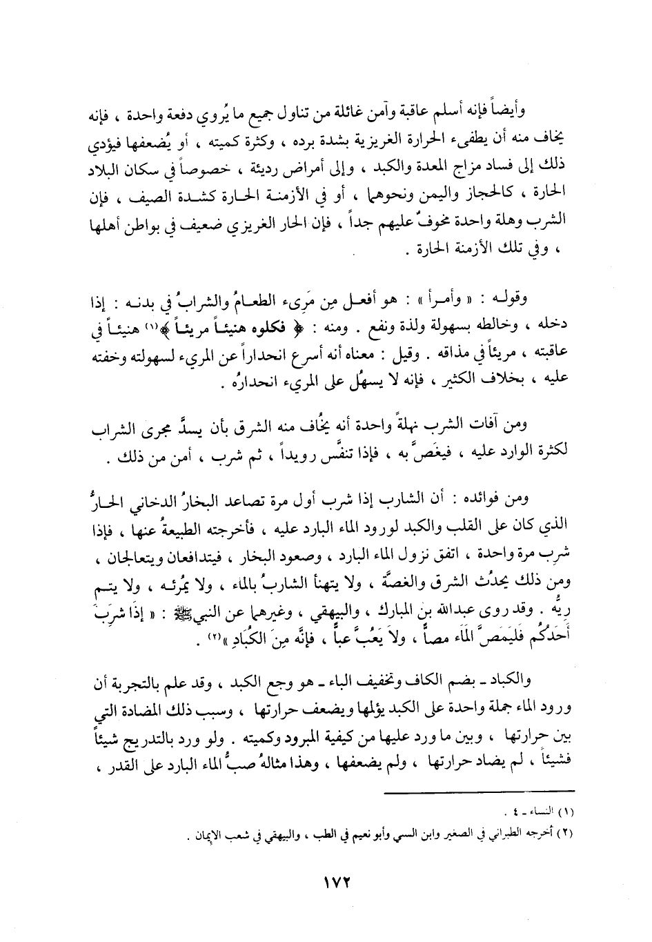 وَأَيْضًا فَإِنَّهُ أَسْلَمُ عَاقِبَةً وَآمَنُ غَائِلَةً مِنْ تَنَاوُلِ جَمِيعِ مَا يُرْوِي دُفْعَةً وَاحِدَةً، فَإِنَّهُ يخاف منه أن يطفىء الْحَرَارَةَ الْغَرِيزِيَّةَ بِشِدَّةِ بَرْدِهِ، وَكَثْرَةِ كَمِّيَّتِهِ، أَوْ يُضْعِفُهَا فَيُؤَدِّي ذَلِكَ إِلَى فَسَادِ مِزَاجِ الْمَعِدَةِ وَالْكَبِدِ، وَإِلَى أَمْرَاضٍ رَدِيئَةٍ، خُصُوصًا فِي سُكَّانِ الْبِلَادِ الْحَارَّةِ، كَالْحِجَازِ وَالْيَمَنِ وَنَحْوِهِمَا، أَوْ فِي الْأَزْمِنَةِ الْحَارَّةِ كَشِدَّةِ الصَّيْفِ، فَإِنَّ الشُّرْبَ وَهْلَةً وَاحِدَةً مَخُوفٌ عَلَيْهِمْ جِدًّا، فَإِنَّ الْحَارَّ الْغَرِيزِيَّ ضَعِيفٌ فِي بَوَاطِنِ أَهْلِهَا، وَفِي تِلْكَ الْأَزْمِنَةِ الحارة.