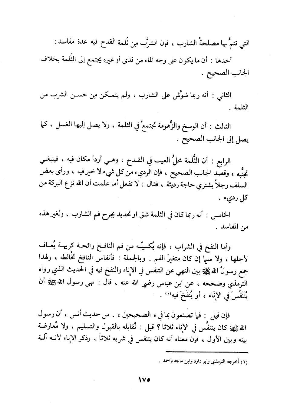 وَأَمَّا النَّفْخُ فِي الشَّرَابِ، فَإِنَّهُ يُكْسِبُهُ مِنْ فَمِ النَّافِخِ رَائِحَةً كَرِيهَةً يُعَافُ لِأَجْلِهَا، وَلَا سِيَّمَا إِنْ كَانَ مُتَغَيِّرَ الْفَمِ. وَبِالْجُمْلَةِ: فَأَنْفَاسُ النَّافِخِ تُخَالِطُهُ، وَلِهَذَا جَمَعَ رَسُولُ اللَّهِ صَلَّى اللَّهُ عَلَيْهِ وَسَلَّمَ بَيْنَ النَّهْيِ عَنِ التَّنَفُّسِ فِي الْإِنَاءِ وَالنَّفْخِ فِيهِ فِي الْحَدِيثِ الَّذِي رَوَاهُ الترمذي وَصَحَّحَهُ، عَنِ ابْنِ عَبَّاسٍ رَضِيَ اللَّهُ عَنْهُ، قَالَ: نَهَى رَسُولُ اللَّهِ صَلَّى اللَّهُ عَلَيْهِ وَسَلَّمَ أَنْ يُتَنَفَّسَ فِي الْإِنَاءِ، أَوْ يُنْفَخَ فِيهِ «1» .