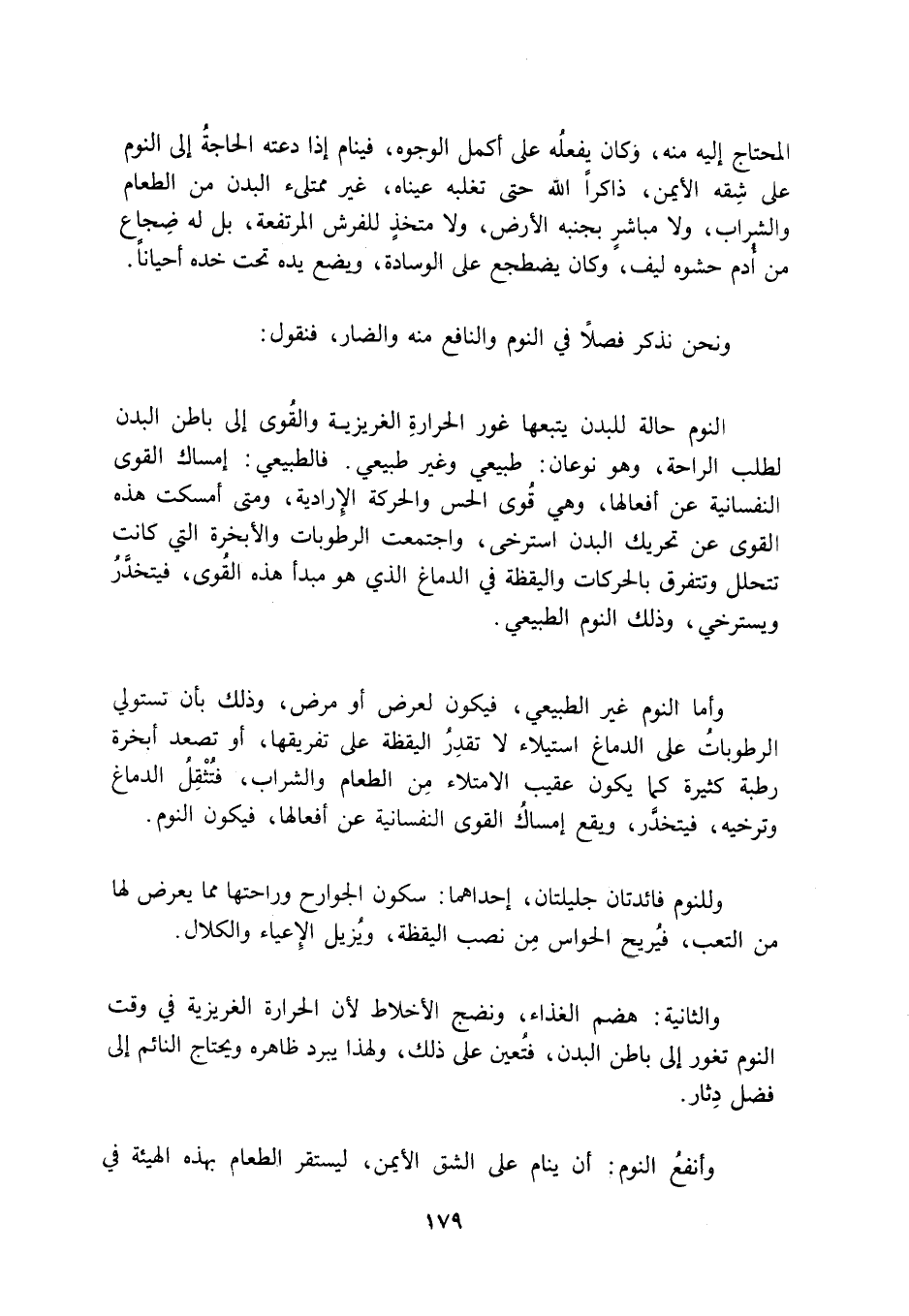 وَنَحْنُ نَذْكُرُ فَصْلًا فِي النَّوْمِ وَالنَّافِعِ مِنْهُ وَالضَّارِّ، فَنَقُولُ: