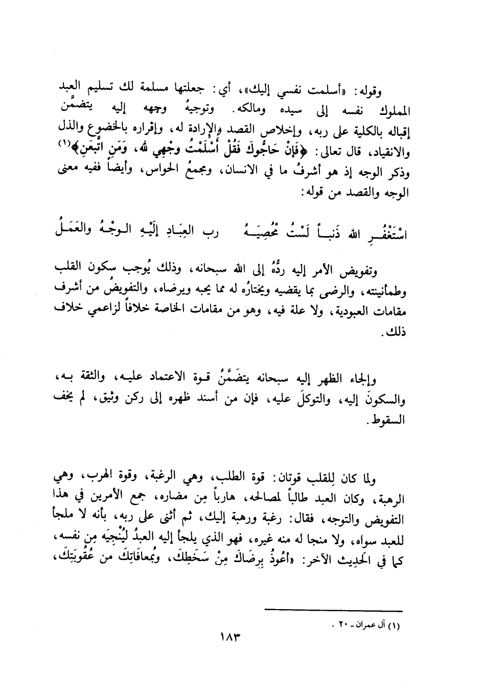 وَقَوْلُهُ: «أَسْلَمْتُ نَفْسِي إِلَيْكَ» ، أَيْ: جَعَلْتُهَا مُسَلَّمَةً لَكَ تَسْلِيمَ الْعَبْدِ الْمَمْلُوكِ نَفْسَهُ إِلَى سَيِّدِهِ وَمَالِكِهِ. وَتَوْجِيهُ وَجْهِهِ إِلَيْهِ يَتَضَمَّنُ إِقْبَالَهُ بِالْكُلِّيَّةِ عَلَى رَبِّهِ، وَإِخْلَاصَ الْقَصْدِ وَالْإِرَادَةِ لَهُ، وَإِقْرَارَهُ بِالْخُضُوعِ وَالذُّلِّ وَالِانْقِيَادِ، قَالَ تَعَالَى: فَإِنْ حَاجُّوكَ فَقُلْ أَسْلَمْتُ وَجْهِيَ لِلَّهِ، وَمَنِ اتَّبَعَنِ «1» وَذَكَرَ الْوَجْهَ إِذْ هُوَ أَشْرَفُ مَا فِي الانسان، ومجمع الحواس، وأيضا ففيه معنى الوجه وَالْقَصْدِ مِنْ قَوْلِهِ: