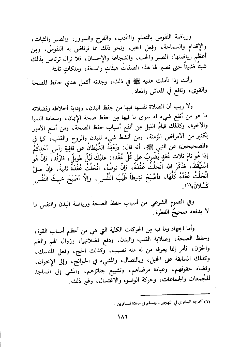 وَلَا رَيْبَ أَنَّ الصلاة نفسها فيها من حفظ الْبَدَنِ، وَإِذَابَةِ أَخْلَاطِهِ وَفَضَلَاتِهِ مَا هُوَ مِنْ أَنْفَعِ شَيْءٍ لَهُ سِوَى مَا فِيهَا مِنْ حِفْظِ صِحَّةِ الْإِيمَانِ، وَسَعَادَةِ الدُّنْيَا وَالْآخِرَةِ، وَكَذَلِكَ قِيَامُ اللَّيْلِ مِنْ أَنْفَعِ أَسْبَابِ حِفْظِ الصِّحَّةِ، وَمِنْ أَمْنَعِ الْأُمُورِ لِكَثِيرٍ مِنَ الْأَمْرَاضِ الْمُزْمِنَةِ، وَمِنْ أَنْشَطِ شَيْءٍ لِلْبَدَنِ وَالرُّوحِ وَالْقَلْبِ، كَمَا فِي «الصَّحِيحَيْنِ» عَنِ النَّبِيِّ صَلَّى اللَّهُ عَلَيْهِ وَسَلَّمَ، أَنَّهُ قَالَ: «يَعْقِدُ الشَّيْطَانُ عَلَى قَافِيَةِ رَأْسِ أَحَدِكُمْ إِذَا هُوَ نَامَ ثَلَاثَ عُقَدٍ يَضْرِبُ عَلَى كُلِّ عُقْدَةٍ: عَلَيْكَ لَيْلٌ طَوِيلٌ، فَارْقُدْ، فَإِنْ هُوَ اسْتَيْقَظَ، فَذَكَرَ اللَّهَ انْحَلَّتْ عُقْدَةٌ، فَإِنْ تَوَضَّأَ، انْحَلَّتْ عُقْدَةٌ ثَانِيَةٌ، فَإِنْ صَلَّى انْحَلَّتْ عُقَدُهُ كُلُّهَا، فَأَصْبَحَ نَشِيطًا طَيِّبَ النَّفْسِ، وَإِلَّا أَصْبَحَ خَبِيثَ النَّفْسِ كَسْلَانَ» «1» .