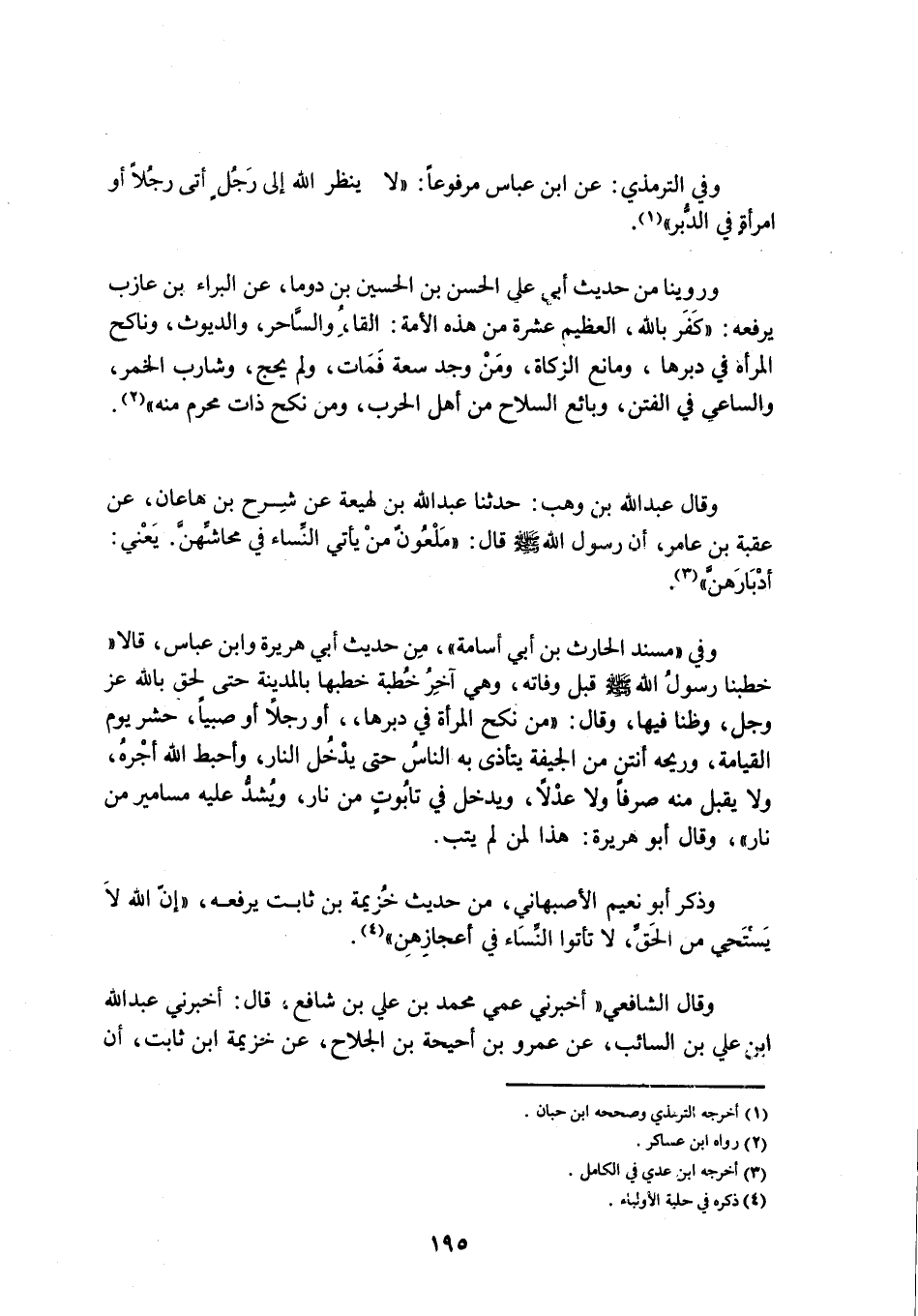 وَفِي الترمذي: عَنِ ابْنِ عَبَّاسٍ مَرْفُوعًا: «لَا يَنْظُرُ اللَّهُ إِلَى رَجُلٍ أَتَى رَجُلًا أَوِ امْرَأَةً فِي الدُّبُرِ» «1» .
