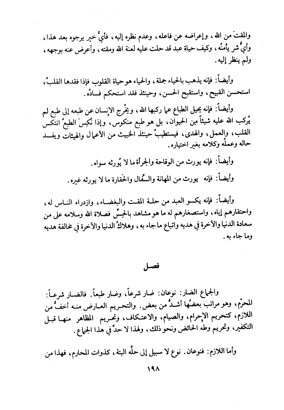وَأَيْضًا: فَإِنَّهُ يَذْهَبُ بِالْحَيَاءِ جُمْلَةً، وَالْحَيَاءُ هُوَ حَيَاةُ الْقُلُوبِ فَإِذَا فَقَدَهَا الْقَلْبُ، اسْتَحْسَنَ الْقَبِيحَ، وَاسْتَقْبَحَ الْحَسَنَ، وَحِينَئِذٍ فَقَدِ اسْتَحْكَمَ فَسَادُهُ.