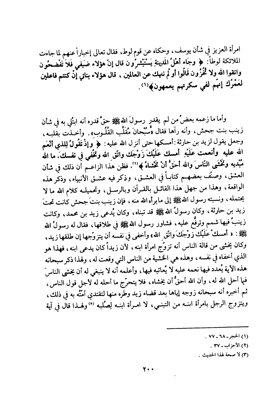 وَأَمَّا مَا زَعَمَهُ بَعْضُ مَنْ لَمْ يُقَدِّرْ رَسُولَ اللَّهِ صَلَّى اللَّهُ عَلَيْهِ وَسَلَّمَ حَقَّ قَدْرِهِ أَنَّهُ ابْتُلِيَ بِهِ فِي شَأْنِ زينب بنت جحش، وَأَنَّهُ رَآهَا فَقَالَ «سُبْحَانَ مُقَلِّبِ الْقُلُوبِ» . وَأَخَذَتْ بِقَلْبِهِ، وَجَعَلَ يَقُولُ لِزَيْدِ بْنِ حَارِثَةَ: أَمْسِكْهَا حَتَّى أَنْزَلَ اللَّهُ عَلَيْهِ: وَإِذْ تَقُولُ لِلَّذِي أَنْعَمَ اللَّهُ عَلَيْهِ وَأَنْعَمْتَ عَلَيْهِ أَمْسِكْ عَلَيْكَ زَوْجَكَ وَاتَّقِ اللَّهَ وَتُخْفِي فِي نَفْسِكَ، مَا اللَّهُ مُبْدِيهِ وَتَخْشَى النَّاسَ وَاللَّهُ أَحَقُّ أَنْ تَخْشاهُ «2» ، فَظَنَّ هَذَا الزَّاعِمُ أَنَّ ذَلِكَ فِي شَأْنِ الْعِشْقِ، وَصَنَّفَ بَعْضُهُمْ كِتَابًا فِي الْعِشْقِ، وَذَكَرَ فِيهِ عِشْقَ الْأَنْبِيَاءِ، وَذَكَرَ هَذِهِ الْوَاقِعَةَ، وَهَذَا مِنْ جَهْلِ هَذَا الْقَائِلِ بِالْقُرْآنِ وَبِالرُّسُلِ، وَتَحْمِيلِهِ كَلَامَ اللَّهِ مَا لَا يَحْتَمِلُهُ، وَنِسْبَتِهِ رَسُولَ اللَّهِ صَلَّى اللَّهُ عَلَيْهِ وَسَلَّمَ إِلَى مَا بَرَّأَهُ اللَّهُ مِنْهُ، فَإِنَّ زينب بنت جحش كَانَتْ تَحْتَ زَيْدِ بْنِ حَارِثَةَ، وَكَانَ رَسُولُ اللَّهِ صَلَّى اللَّهُ عَلَيْهِ وَسَلَّمَ قَدْ تَبَنَّاهُ، وَكَانَ يُدْعَى زيد بن محمد، وَكَانَتْ زينب فِيهَا شَمَمٌ وَتَرَفُّعٌ عَلَيْهِ، فَشَاوَرَ رَسُولَ اللَّهِ صَلَّى اللَّهُ عَلَيْهِ وَسَلَّمَ فِي طَلَاقِهَا، فَقَالَ لَهُ رَسُولُ اللَّهِ صَلَّى اللَّهُ عَلَيْهِ وسلم: «أمسك عليك زوجك واتّق الله» وَأَخْفَى فِي نَفْسِهِ أَنْ يَتَزَوَّجَهَا إِنْ طَلَّقَهَا زيد، وَكَانَ يَخْشَى مِنْ قَالَةِ النَّاسِ أَنَّهُ تَزَوَّجَ امْرَأَةَ ابْنِهِ، لِأَنَّ زيدا كَانَ يُدْعَى ابْنَهُ، فَهَذَا هُوَ الَّذِي أَخْفَاهُ فِي نَفْسِهِ، وَهَذِهِ هِيَ الْخَشْيَةُ مِنَ النَّاسِ الَّتِي وَقَعَتْ لَهُ، وَلِهَذَا ذَكَرَ سُبْحَانَهُ هَذِهِ الْآيَةَ يُعَدِّدُ فِيهَا نِعَمَهُ عَلَيْهِ لَا يُعَاتِبُهُ فِيهَا، وَأَعْلَمَهُ أَنَّهُ لَا يَنْبَغِي لَهُ أَنْ يَخْشَى النَّاسَ فِيمَا أَحَلَّ اللَّهُ لَهُ، وَأَنَّ اللَّهَ أَحَقُّ أَنْ يَخْشَاهُ، فَلَا يَتَحَرَّجُ مَا أَحَلَّهُ لَهُ لِأَجْلِ قَوْلِ النَّاسِ، ثُمَّ أَخْبَرَهُ أَنَّهُ سُبْحَانَهُ زَوَّجَهُ إِيَّاهَا بَعْدَ قَضَاءِ زيد وَطَرَهُ مِنْهَا لِتَقْتَدِيَ أُمَّتُهُ بِهِ فِي ذَلِكَ، وَيَتَزَوَّجَ الرَّجُلُ بِامْرَأَةِ ابْنِهِ مِنَ التَّبَنِّي، لَا امْرَأَةِ ابْنِهِ لصلبه «3» ولهذا قال في آية