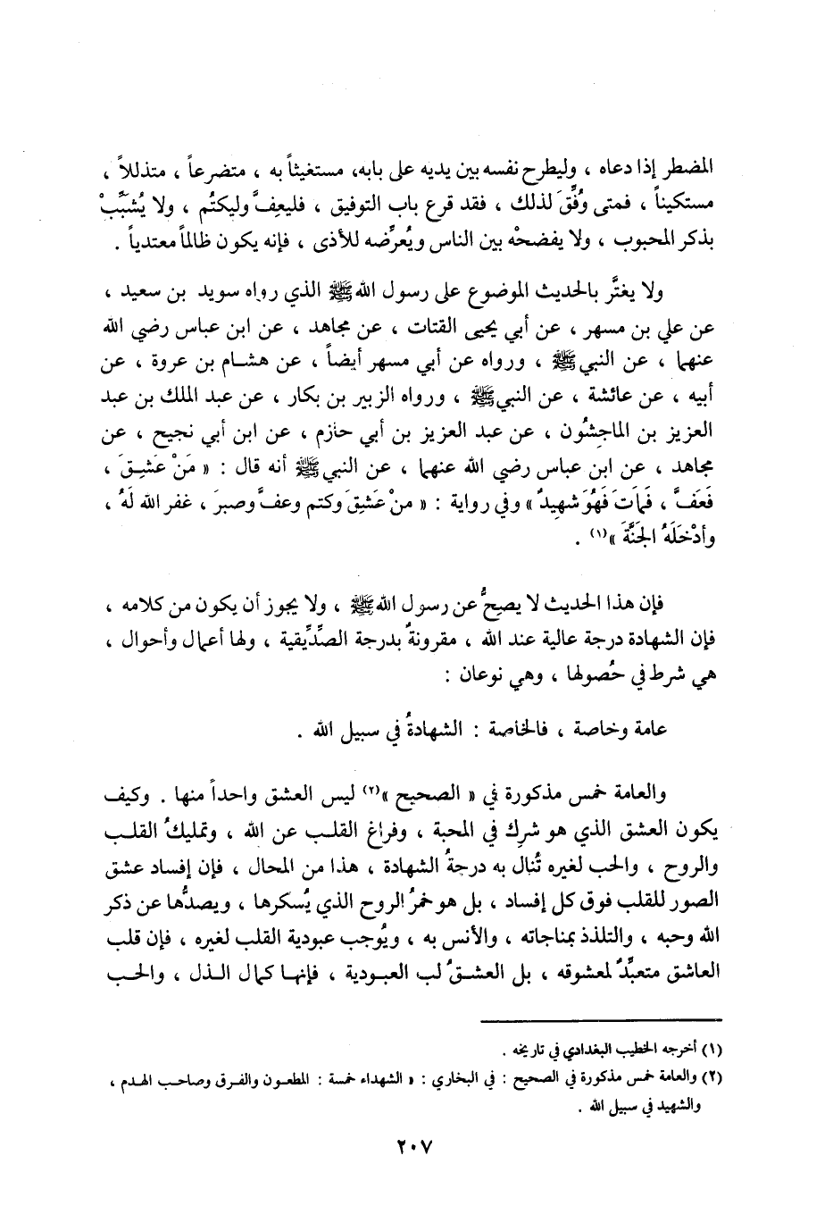 وَلَا يَغْتَرَّ بِالْحَدِيثِ الْمَوْضُوعِ عَلَى رَسُولِ اللَّهِ صلى الله عليه وسلم الذي رَوَاهُ سُوَيْدُ بْنُ سَعِيدٍ، عَنْ عَلِيِّ بْنِ مُسْهِرٍ، عَنْ أبي يحيى القتات، عَنْ مجاهد، عَنِ ابْنِ عَبَّاسٍ رَضِيَ اللَّهُ عَنْهُمَا، عَنِ النَّبِيِّ صَلَّى اللَّهُ عَلَيْهِ وَسَلَّمَ، وَرَوَاهُ عَنْ أَبِي مُسْهِرٍ أَيْضًا، عَنْ هِشَامِ بْنِ عُرْوَةَ، عَنْ أَبِيهِ، عَنْ عائشة، عَنِ النَّبِيِّ صَلَّى اللَّهُ عَلَيْهِ وَسَلَّمَ، وَرَوَاهُ الزُّبَيْرُ بْنُ بَكَّارٍ، عَنْ عَبْدِ الْمَلِكِ بْنِ عَبْدِ الْعَزِيزِ بْنِ الْمَاجِشُونِ، عَنْ عَبْدِ الْعَزِيزِ بْنِ أَبِي حَازِمٍ، عَنْ ابْنِ أَبِي نَجِيحٍ، عَنْ مجاهد، عَنِ ابْنِ عَبَّاسٍ رَضِيَ اللَّهُ عَنْهُمَا، عَنِ النَّبِيِّ صَلَّى اللَّهُ عَلَيْهِ وَسَلَّمَ أَنَّهُ قَالَ: «مَنْ عَشِقَ، فَعَفَّ، فَمَاتَ فَهُوَ شَهِيدٌ» وَفِي رِوَايَةٍ: «مَنْ عَشِقَ وَكَتَمَ وَعَفَّ وَصَبَرَ، غَفَرَ اللَّهُ لَهُ، وَأَدْخَلَهُ الْجَنَّةَ» «1» .