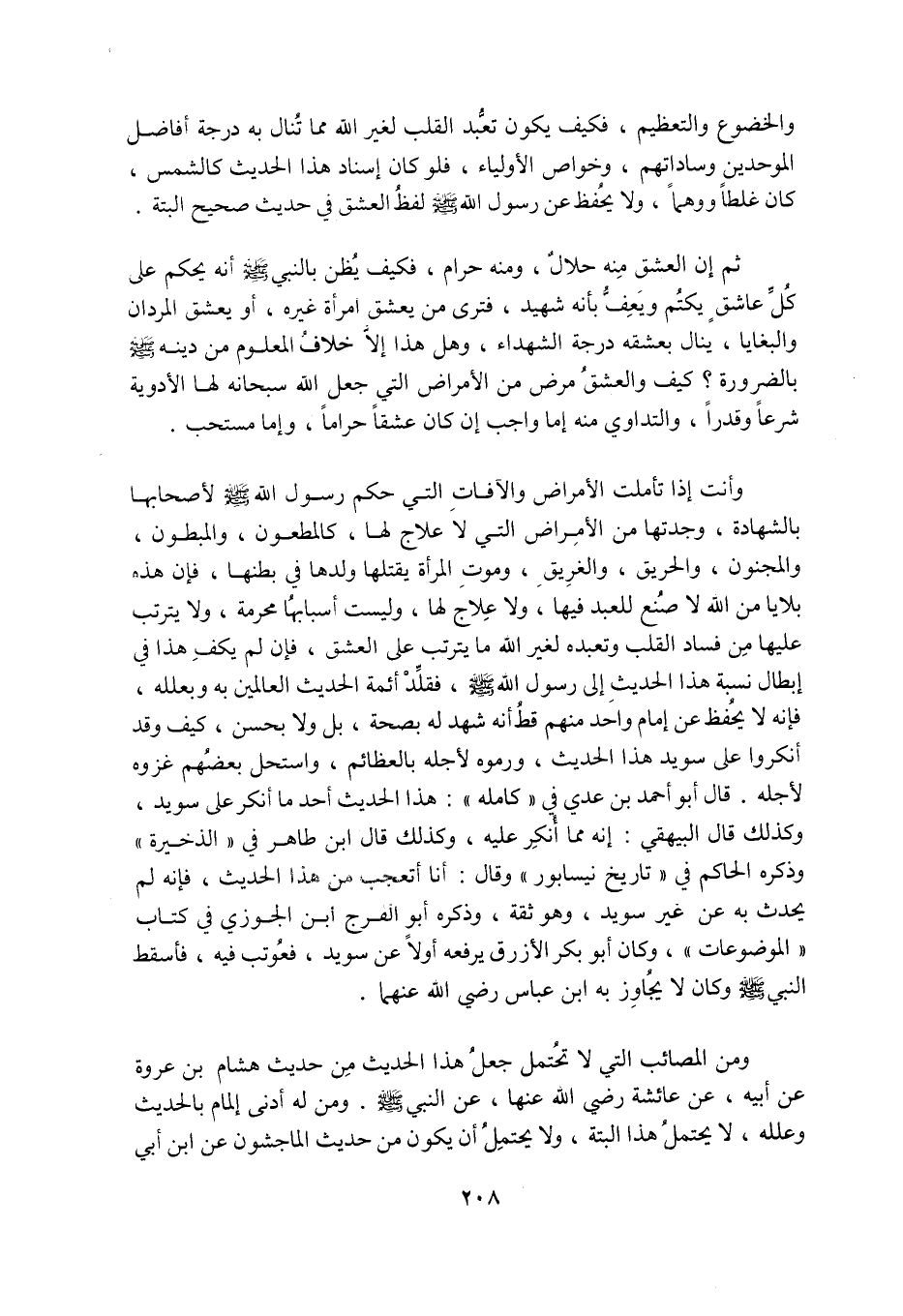 وَأَنْتَ إِذَا تَأَمَّلْتَ الْأَمْرَاضَ وَالْآفَاتِ الَّتِي حُكْمِ رَسُولِ اللَّهِ صَلَّى اللَّهُ عَلَيْهِ وَسَلَّمَ لِأَصْحَابِهَا بِالشَّهَادَةِ، وَجَدْتَهَا مِنَ الْأَمْرَاضِ الَّتِي لَا عِلَاجَ لها، كالمطعون، والمبطون، والمجنون، والحريق، وَالْغَرِيقِ، وَمَوْتِ الْمَرْأَةِ يَقْتُلُهَا وَلَدُهَا فِي بَطْنِهَا، فَإِنَّ هَذِهِ بَلَايَا مِنَ اللَّهِ لَا صُنْعَ لِلْعَبْدِ فِيهَا، وَلَا عِلَاجَ لَهَا، وَلَيْسَتْ أَسْبَابُهَا مُحَرَّمَةً، وَلَا يَتَرَتَّبُ عَلَيْهَا مِنْ فَسَادِ الْقَلْبِ وَتَعَبُّدِهِ لِغَيْرِ اللَّهِ مَا يَتَرَتَّبُ عَلَى الْعِشْقِ، فَإِنْ لَمْ يَكْفِ هَذَا فِي إِبْطَالِ نِسْبَةِ هَذَا الْحَدِيثِ إِلَى رَسُولِ اللَّهِ صَلَّى اللَّهُ عَلَيْهِ وَسَلَّمَ، فَقَلِّدْ أَئِمَّةَ الْحَدِيثِ الْعَالِمِينَ بِهِ وَبِعِلَلِهِ، فَإِنَّهُ لَا يُحْفَظُ عَنْ إِمَامٍ وَاحِدٍ مِنْهُمْ قَطُّ أَنَّهُ شَهِدَ لَهُ بِصِحَّةٍ، بَلْ وَلَا بِحُسْنٍ، كَيْفَ وَقَدْ أَنْكَرُوا عَلَى سويد هَذَا الْحَدِيثَ، وَرَمَوْهُ لِأَجْلِهِ بِالْعَظَائِمِ، وَاسْتَحَلَّ بَعْضُهُمْ غَزْوَهُ لِأَجْلِهِ. قَالَ أَبُو أَحْمَدَ بْنُ عَدِيٍّ فِي «كَامِلِهِ» : هَذَا الْحَدِيثُ أَحَدُ مَا أُنْكِرَ عَلَى سويد، وَكَذَلِكَ قَالَ البيهقي: إِنَّهُ مِمَّا أُنْكِرَ عَلَيْهِ، وَكَذَلِكَ قَالَ ابْنُ طَاهِرٍ فِي «الذَّخِيرَةِ» وَذَكَرَهُ الحاكم فِي «تَارِيخِ نَيْسَابُورَ» وَقَالَ: أَنَا أَتَعَجَّبُ مِنْ هَذَا الْحَدِيثِ، فَإِنَّهُ لَمْ يُحَدَّثْ بِهِ عَنْ غَيْرِ سويد، وَهُوَ ثِقَةٌ، وذكره أبو الفرج ابن الْجَوْزِيُّ فِي كِتَابِ «الْمَوْضُوعَاتِ» ، وَكَانَ أبو بكر الأزرق يَرْفَعُهُ أَوَّلًا عَنْ سويد، فَعُوتِبَ فِيهِ، فَأَسْقَطَ النَّبِيَّ صَلَّى اللَّهُ عَلَيْهِ وَسَلَّمَ وَكَانَ لَا يُجَاوِزُ بِهِ ابْنَ عَبَّاسٍ رَضِيَ اللَّهُ عَنْهُمَا.