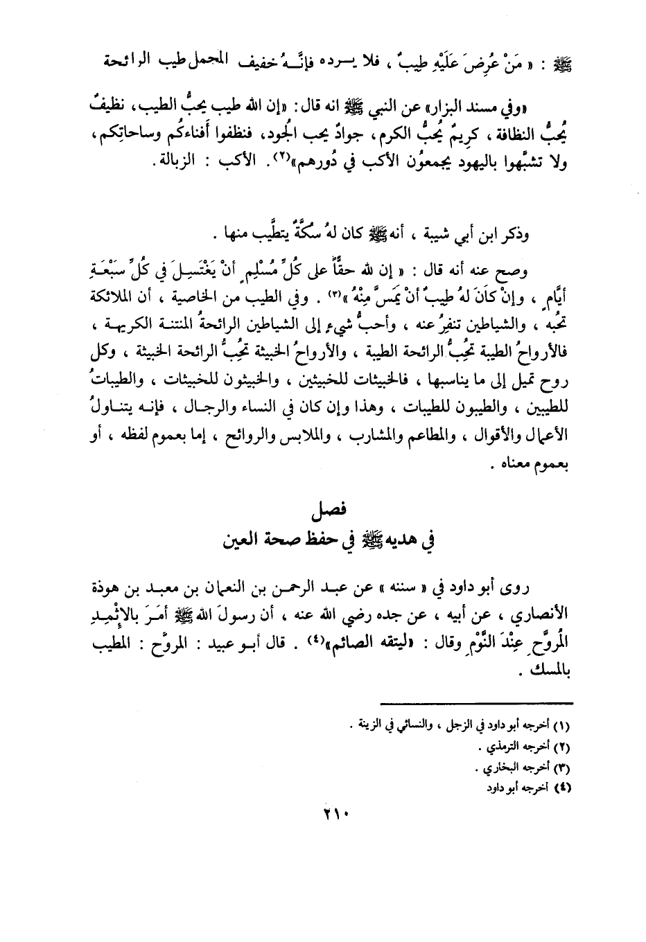 رَوَى أبو داود فِي «سُنَنِهِ» عَنْ عبد الرحمن بن النعمان بن معبد بن هوذة الأنصاري، عَنْ أَبِيهِ، عَنْ جَدِّهِ رَضِيَ اللَّهُ عَنْهُ، أَنَّ رَسُولَ اللَّهِ صَلَّى اللَّهُ عَلَيْهِ وَسَلَّمَ أَمَرَ بِالْإِثْمِدِ الْمُرَوَّحِ عِنْدَ النَّوْمِ وَقَالَ: «لِيَتَّقِهِ الصَّائِمُ» «4» . قَالَ أبو عبيد: المروّح: المطيب بالمسك.