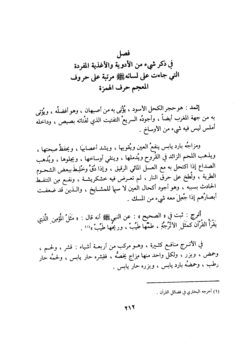 فَصْلٌ فِي ذِكْرِ شَيْءٍ مِنَ الْأَدْوِيَةِ وَالْأَغْذِيَةِ الْمُفْرَدَةِ الَّتِي جَاءَتْ عَلَى لِسَانِهِ صَلَّى اللَّهُ عَلَيْهِ وَسَلَّمَ مُرَتَّبَةً عَلَى حُرُوفِ الْمُعْجَمِ
