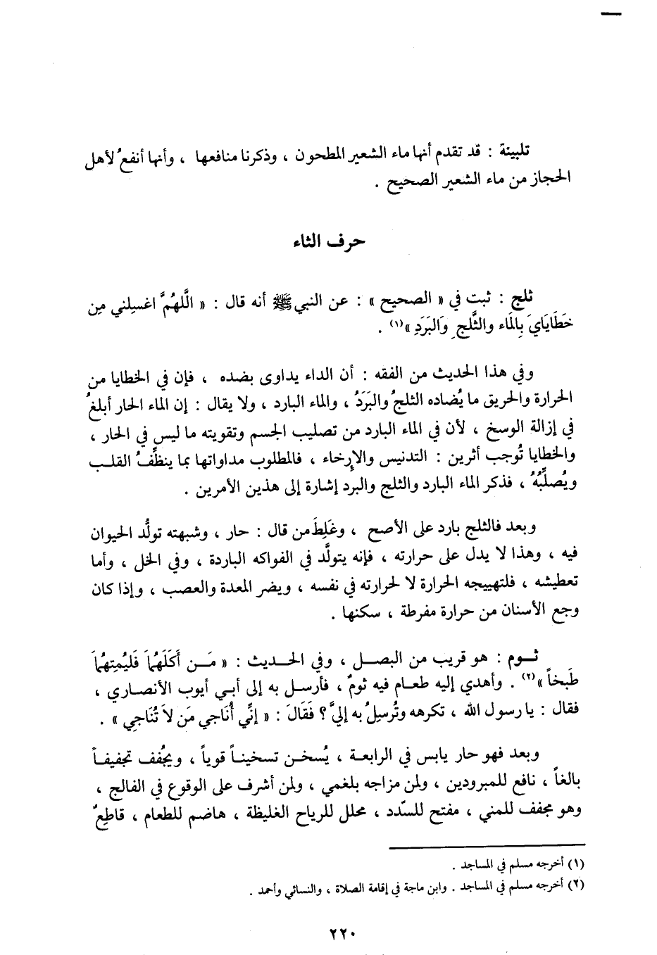 ثَلْجٌ: ثَبَتَ فِي «الصَّحِيحِ» : عَنِ النَّبِيِّ صَلَّى اللَّهُ عَلَيْهِ وَسَلَّمَ أَنَّهُ قَالَ: «اللَّهُمَّ اغْسِلْنِي مِنْ خَطَايَايَ بِالْمَاءِ وَالثَّلْجِ وَالْبَرَدِ» «1» .