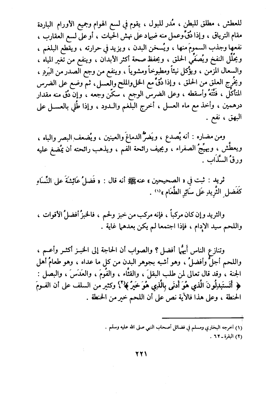 وَالثَّرِيدُ وَإِنْ كَانَ مُرَكَّبًا، فَإِنَّهُ مُرَكَّبٌ مِنْ خُبْزٍ وَلَحْمٍ، فَالْخُبْزُ أَفْضَلُ الْأَقْوَاتِ، وَاللَّحْمُ سَيِّدُ الْإِدَامِ، فَإِذَا اجْتَمَعَا لَمْ يَكُنْ بَعْدَهُمَا غَايَةٌ.
