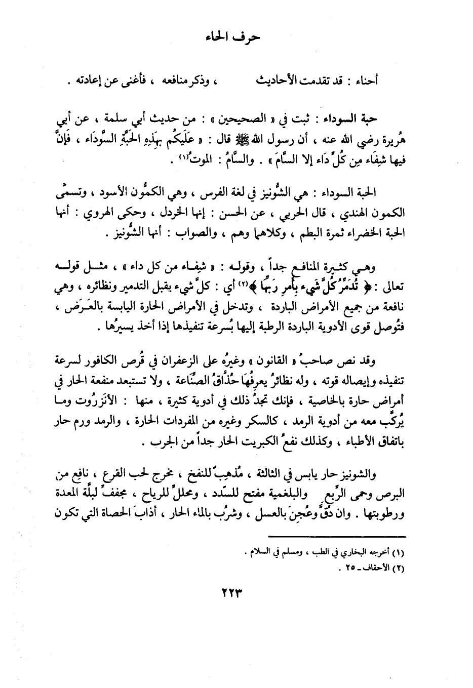 حَبَّةُ السَّوْدَاءِ: ثَبَتَ فِي «الصَّحِيحَيْنِ» : مِنْ حَدِيثِ أبي سلمة، عَنْ أَبِي هُرَيْرَةَ رَضِيَ اللَّهُ عَنْهُ، أَنَّ رَسُولَ اللَّهِ صَلَّى اللَّهُ عَلَيْهِ وسلم قال: «عَلَيْكُمْ بِهَذِهِ الْحَبَّةِ السَّوْدَاءِ، فَإِنَّ فِيهَا شِفَاءً مِنْ كُلِّ دَاءٍ إِلَّا السَّامَ» . وَالسَّامُ: الْمَوْتُ «1» .