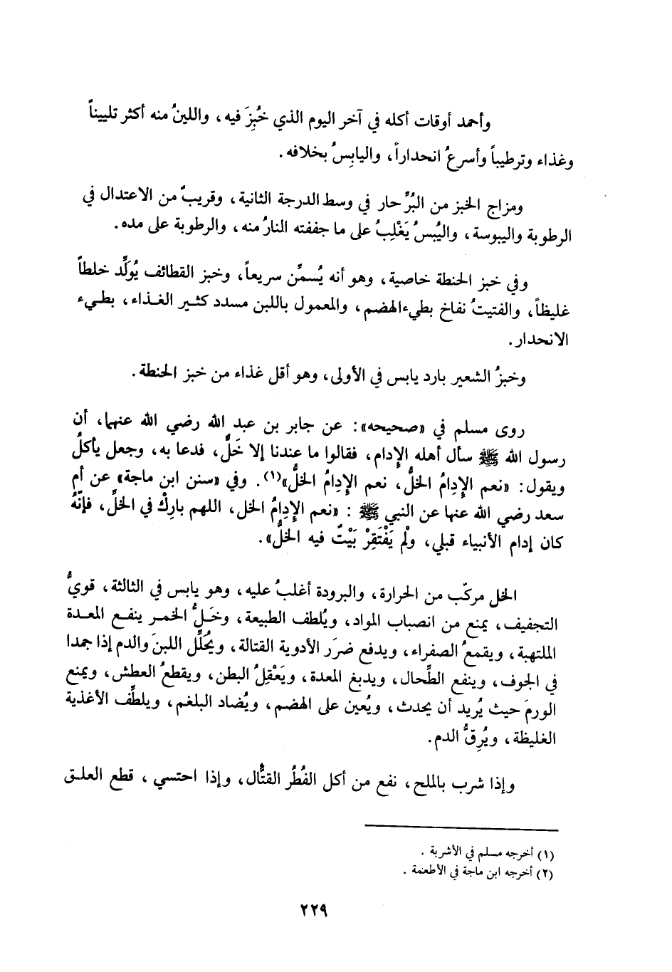 رَوَى مسلم فِي «صَحِيحِهِ» : عَنْ جَابِرِ بْنِ عَبْدِ اللَّهِ رَضِيَ اللَّهُ عَنْهُمَا، أَنَّ رَسُولَ اللَّهِ صَلَّى اللَّهُ عَلَيْهِ وَسَلَّمَ سَأَلَ أَهْلَهُ الْإِدَامَ، فَقَالُوا مَا عِنْدَنَا إِلَّا خَلٌّ، فَدَعَا بِهِ، وَجَعَلَ يَأْكُلُ وَيَقُولُ: «نِعْمَ الْإِدَامُ الْخَلُّ، نِعْمَ الْإِدَامُ الْخَلُّ» «1» . وَفِي «سُنَنِ ابْنِ مَاجَهْ» عَنْ أم سعد رَضِيَ اللَّهُ عَنْهَا عَنِ النَّبِيِّ صَلَّى اللَّهُ عَلَيْهِ وَسَلَّمَ: «نِعْمَ الْإِدَامُ الْخَلُّ، اللَّهُمَّ بَارِكْ فِي الْخَلِّ، فَإِنَّهُ كَانَ إِدَامَ الْأَنْبِيَاءِ قَبْلِي، وَلَمْ يَفْتَقِرْ بَيْتٌ فِيهِ الْخَلُّ» «2» .