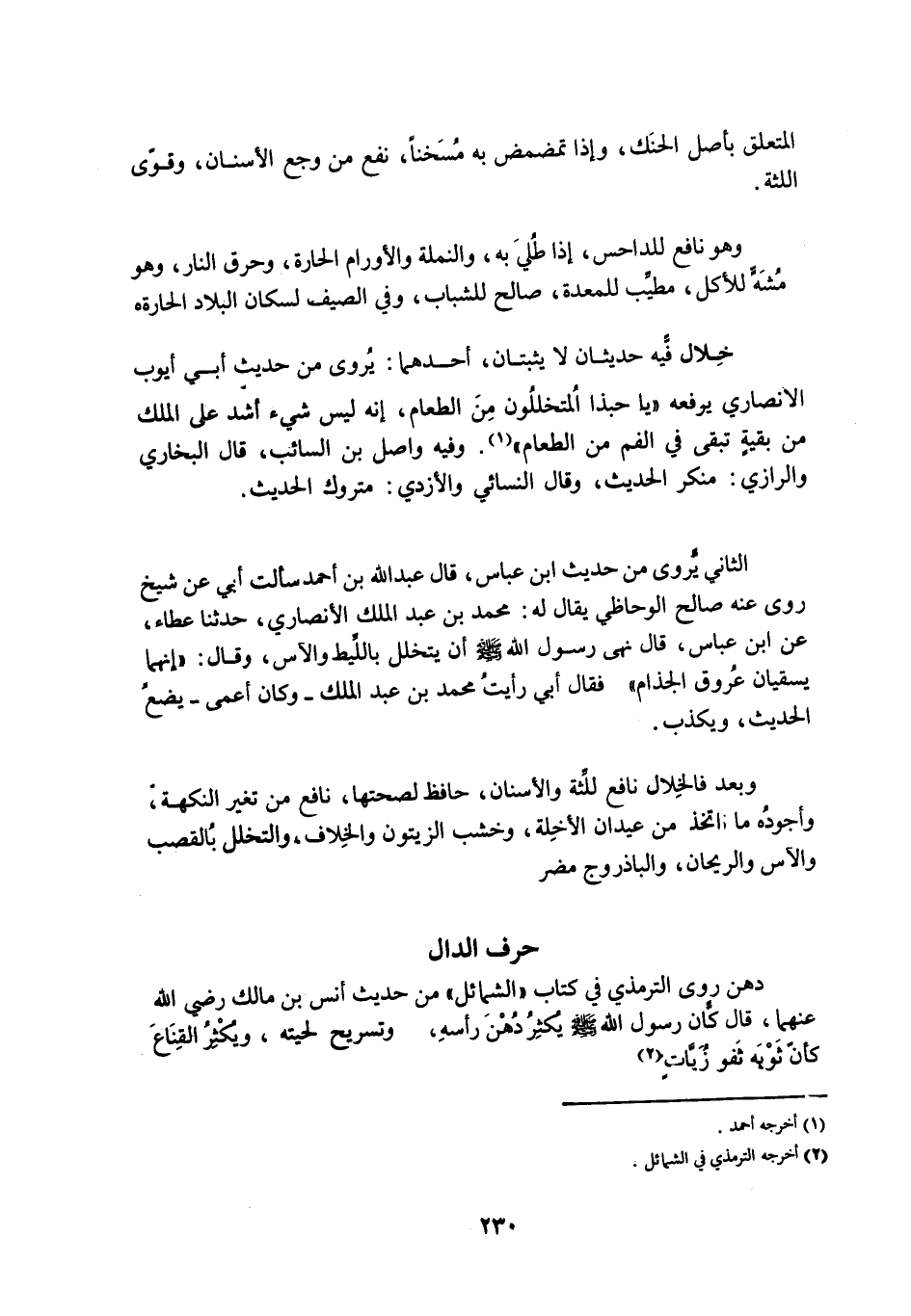 دُهْنٌ رَوَى الترمذي فِي كِتَابِ «الشَّمَائِلِ» مِنْ حَدِيثِ أَنَسِ بْنِ مَالِكٍ رَضِيَ اللَّهُ عَنْهُمَا، قَالَ كَانَ رَسُولُ اللَّهِ صَلَّى اللَّهُ عَلَيْهِ وَسَلَّمَ يُكْثِرُ دُهْنَ رَأْسِهِ، وَتَسْرِيحَ لِحْيَتِهِ، وَيُكْثِرُ الْقِنَاعَ كأنّ ثوبه ثفو زيّات «2»