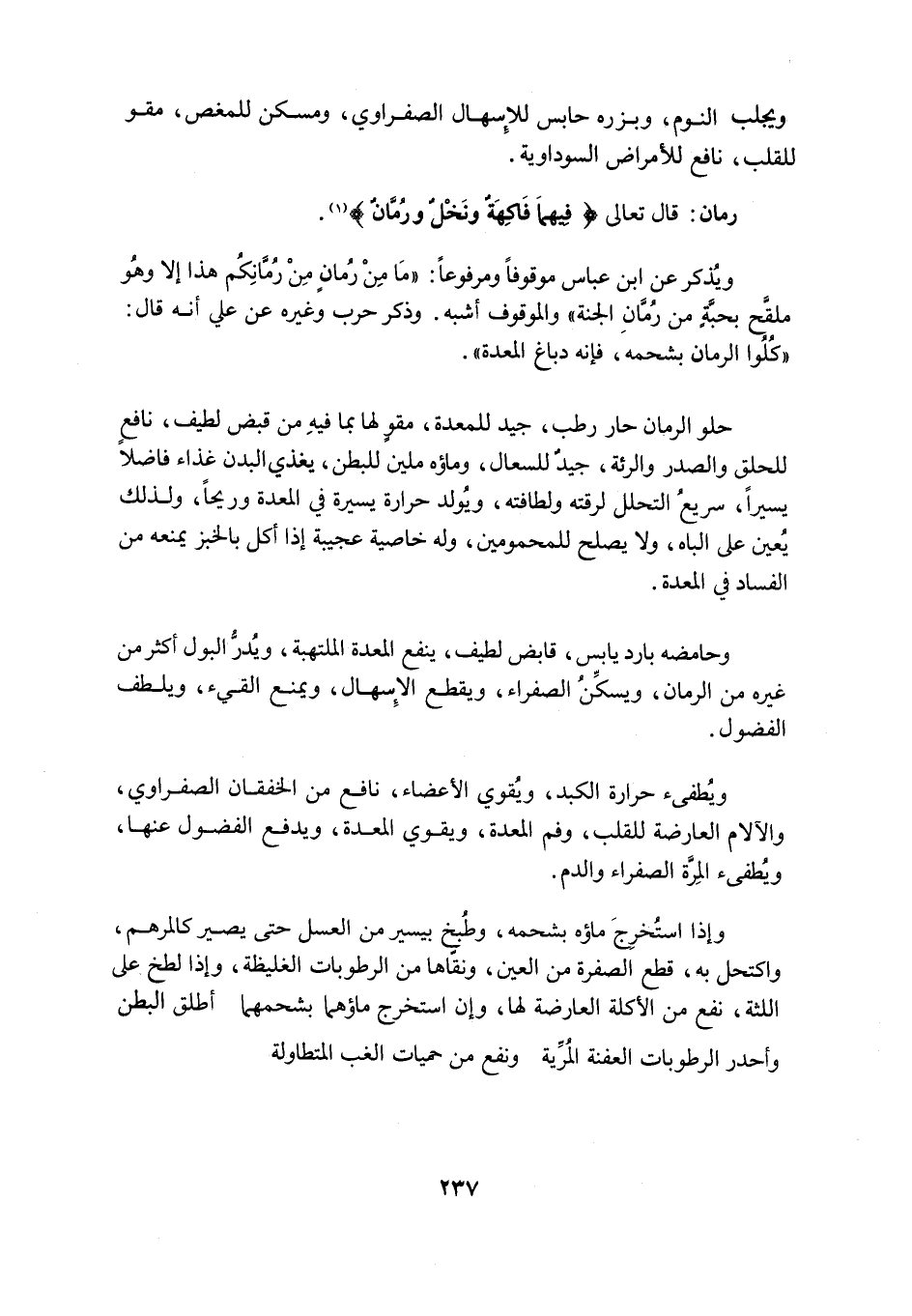 وَحَامِضُهُ بَارِدٌ يَابِسٌ، قَابِضٌ لَطِيفٌ، يَنْفَعُ الْمَعِدَةَ الْمُلْتَهِبَةَ، وَيُدِرُّ الْبَوْلَ أَكْثَرَ مِنْ غَيْرِهِ مِنَ الرُّمَّانِ، وَيُسَكِّنُ الصَّفْرَاءَ، ويقطع الإسهال، ويمنع القيء، ويلطف الفضول.
