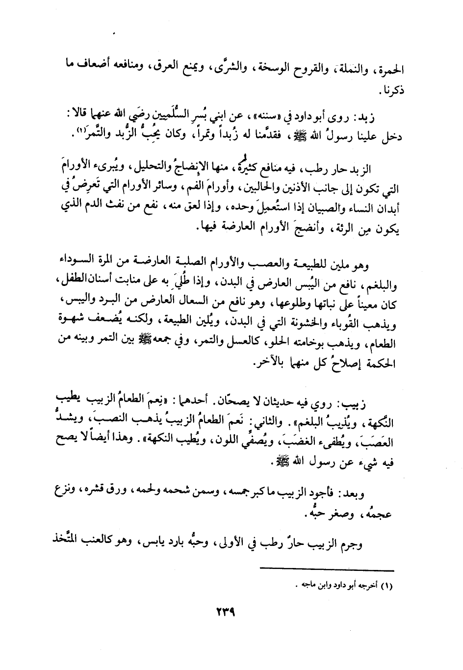 زبيب: رُوِيَ فِيهِ حَدِيثَانِ لَا يَصِحَّانِ. أَحَدُهُمَا: «نِعْمَ الطَّعَامُ الزَّبِيبُ يُطَيِّبُ النَّكْهَةَ، وَيُذِيبُ الْبَلْغَمَ» . وَالثَّانِي: نِعْمَ الطَّعَامُ الزَّبِيبُ يُذْهِبُ النَّصَبَ، وَيَشُدُّ الْعَصَبَ، ويطفىء الْغَضَبَ، وَيُصَفِّي اللَّوْنَ، وَيُطَيِّبُ النَّكْهَةَ» . وَهَذَا أَيْضًا لَا يَصِحُّ فِيهِ شَيْءٌ عَنْ رَسُولِ اللَّهِ صَلَّى اللَّهُ عَلَيْهِ وَسَلَّمَ.
