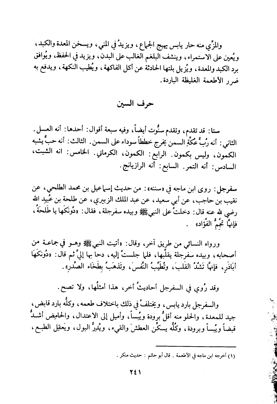سفرجل: رَوَى ابْنُ مَاجَهْ فِي «سُنَنِهِ» : مِنْ حَدِيثِ إسماعيل بن محمد الطلحي، عَنْ نقيب بن حاجب، عَنْ أبي سعيد، عَنْ عبد الملك الزبيري، عَنْ طَلْحَةَ بْنِ عُبَيْدِ اللَّهِ رَضِيَ لله عَنْهُ قَالَ: دَخَلْتُ عَلَى النَّبِيِّ صَلَّى اللَّهُ عَلَيْهِ وَسَلَّمَ وَبِيَدِهِ سَفَرْجَلَةٌ، فَقَالَ: «دُونَكَهَا يَا طلحة، فَإِنَّهَا تُجِمُّ الْفُؤَادَ» «1» .