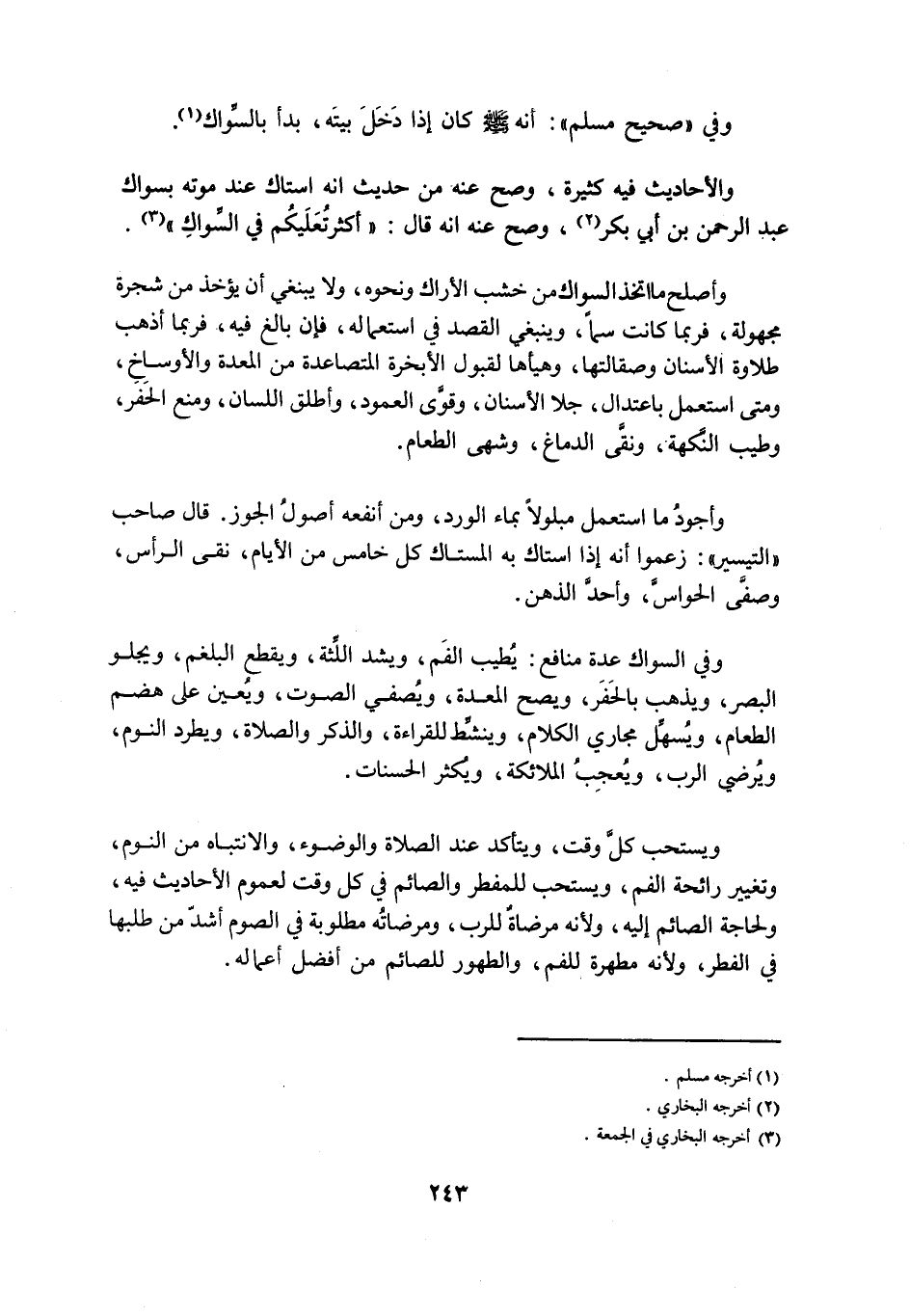 وَفِي السِّوَاكِ عِدَّةُ مَنَافِعَ: يُطَيِّبُ الْفَمَ، وَيَشُدُّ اللِّثَةَ، وَيَقْطَعُ الْبَلْغَمَ، وَيَجْلُو الْبَصَرَ، وَيَذْهَبُ بِالْحَفَرِ، وَيُصِحُّ الْمَعِدَةَ، وَيُصَفِّي الصَّوْتَ، وَيُعِينُ عَلَى هَضْمِ الطَّعَامِ، وَيُسَهِّلُ مَجَارِيَ الْكَلَامِ، وَيُنَشِّطُ لِلْقِرَاءَةِ، وَالذِّكْرِ وَالصَّلَاةِ، وَيَطْرُدُ النَّوْمَ، وَيُرْضِي الرَّبَّ، وَيُعْجِبُ الْمَلَائِكَةَ، وَيُكْثِرُ الْحَسَنَاتِ.