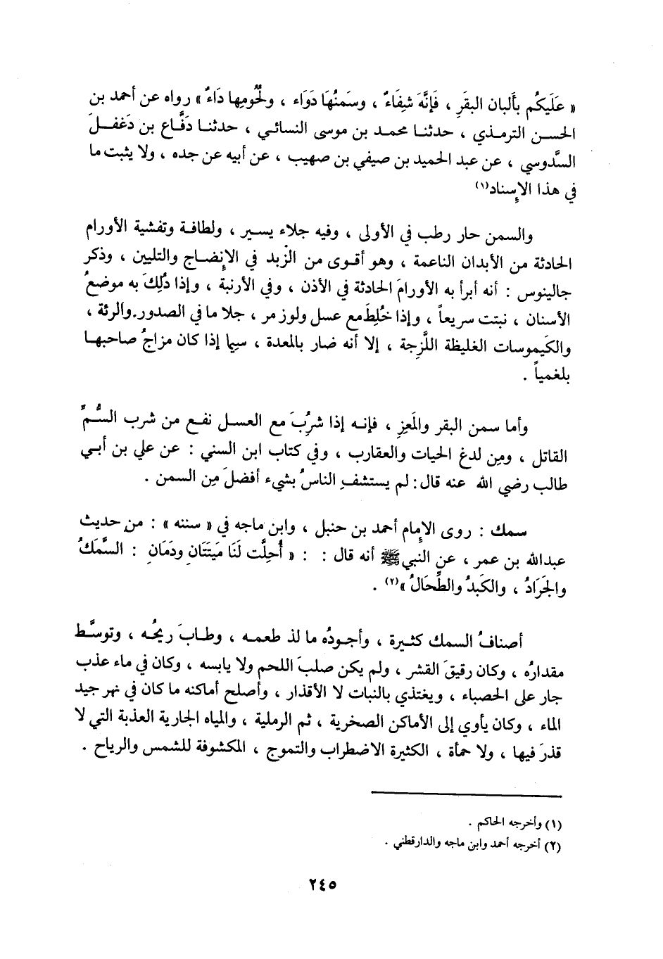 سمك: رَوَى الْإِمَامُ أَحْمَدُ بْنُ حَنْبَلٍ، وَابْنُ مَاجَهْ في «سننه» : من حديث عبد الله بن عُمَرَ، عَنِ النَّبِيِّ صَلَّى اللَّهُ عَلَيْهِ وَسَلَّمَ أَنَّهُ قَالَ: «أُحِلَّتْ لَنَا مَيْتَتَانِ وَدَمَانِ: السَّمَكُ وَالْجَرَادُ، وَالْكَبِدُ وَالطِّحَالُ» «2» .