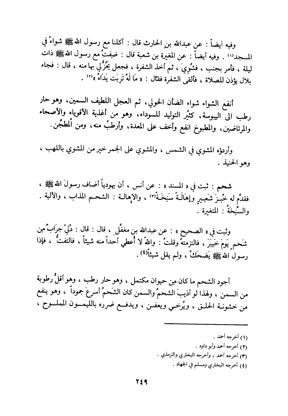 وَفِيهِ أَيْضًا: عَنْ عبد الله بن الحارث قَالَ: أَكَلْنَا مَعَ رَسُولِ اللَّهِ صَلَّى اللَّهُ عَلَيْهِ وَسَلَّمَ شِوَاءً فِي الْمَسْجِدِ «1» . وَفِيهِ أَيْضًا: عَنِ الْمُغِيرَةِ بْنِ شُعْبَةَ قَالَ: ضِفْتُ مَعَ رَسُولِ اللَّهِ صَلَّى اللَّهُ عَلَيْهِ وَسَلَّمَ ذات لَيْلَةٍ، فَأَمَرَ بِجَنْبٍ، فَشُوِيَ، ثُمَّ أَخَذَ الشَّفْرَةَ، فَجَعَلَ يَحُزُّ لِي بِهَا مِنْهُ، قَالَ: فَجَاءَ بلال يُؤَذِّنُ لِلصَّلَاةِ، فَأَلْقَى الشَّفْرَةَ فَقَالَ: «مَا لَهُ تَرِبَتْ يَدَاهُ» » .