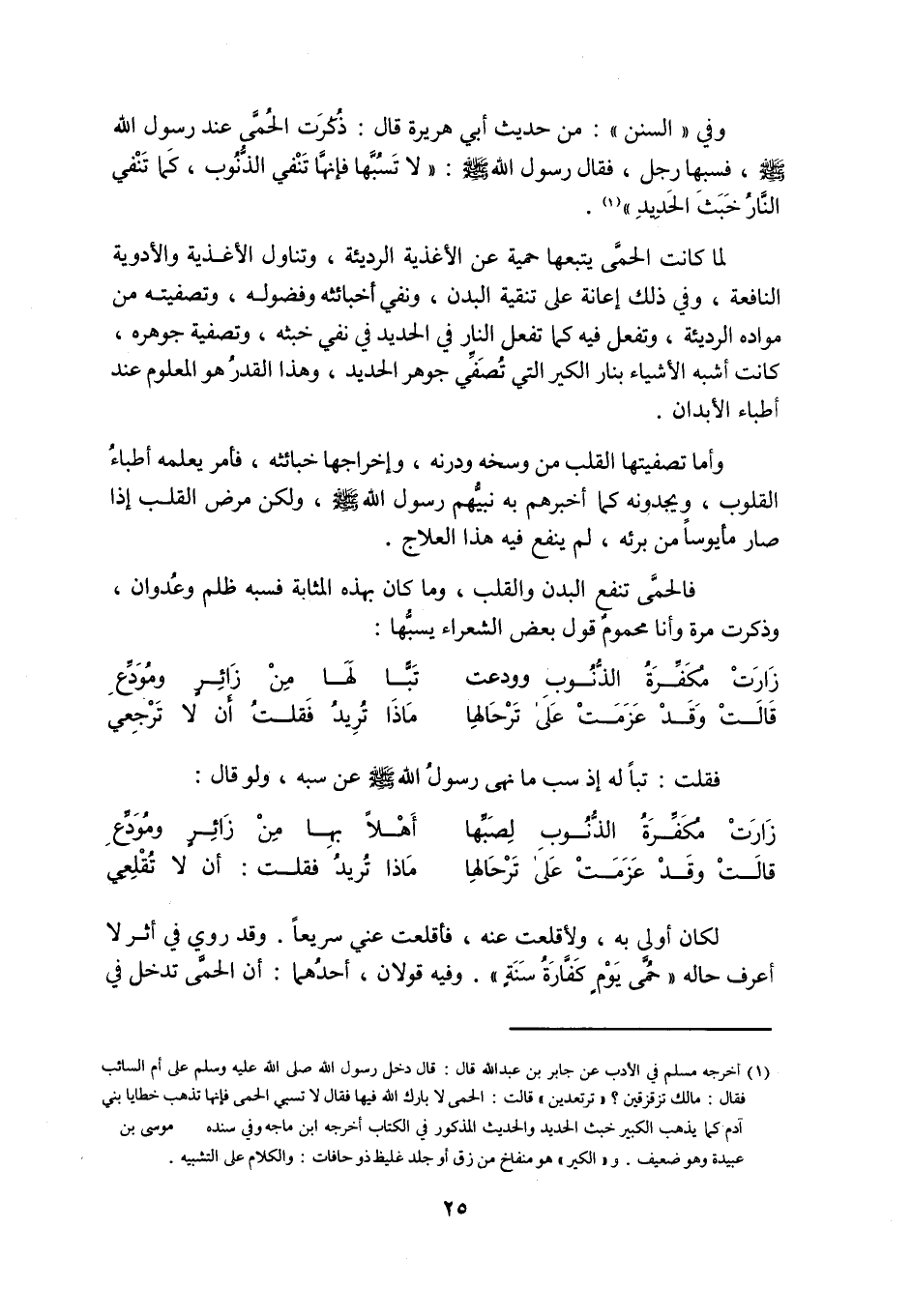 (1) أخرجه مسلم في الأدب عن جابر بن عبد الله قال: قَالَ دَخَلَ رَسُولُ اللَّهِ صَلَّى اللَّهُ عَلَيْهِ وسلم على أم السائب فقال: مالك تزقزقين؟ «ترتعدين» قالت: الحمى لا بارك الله فيها فقال لا تسبي الحمى فإنها تذهب خطايا بني آدم كما يذهب الكبير خبث الحديد والحديث المذكور في الكتاب أخرجه ابن ماجه وفي سنده موسى بن عبيدة وهو ضعيف. و «الكير» هو منفاخ من زق أو جلد غليظ ذو حافات: والكلام على التشبيه.