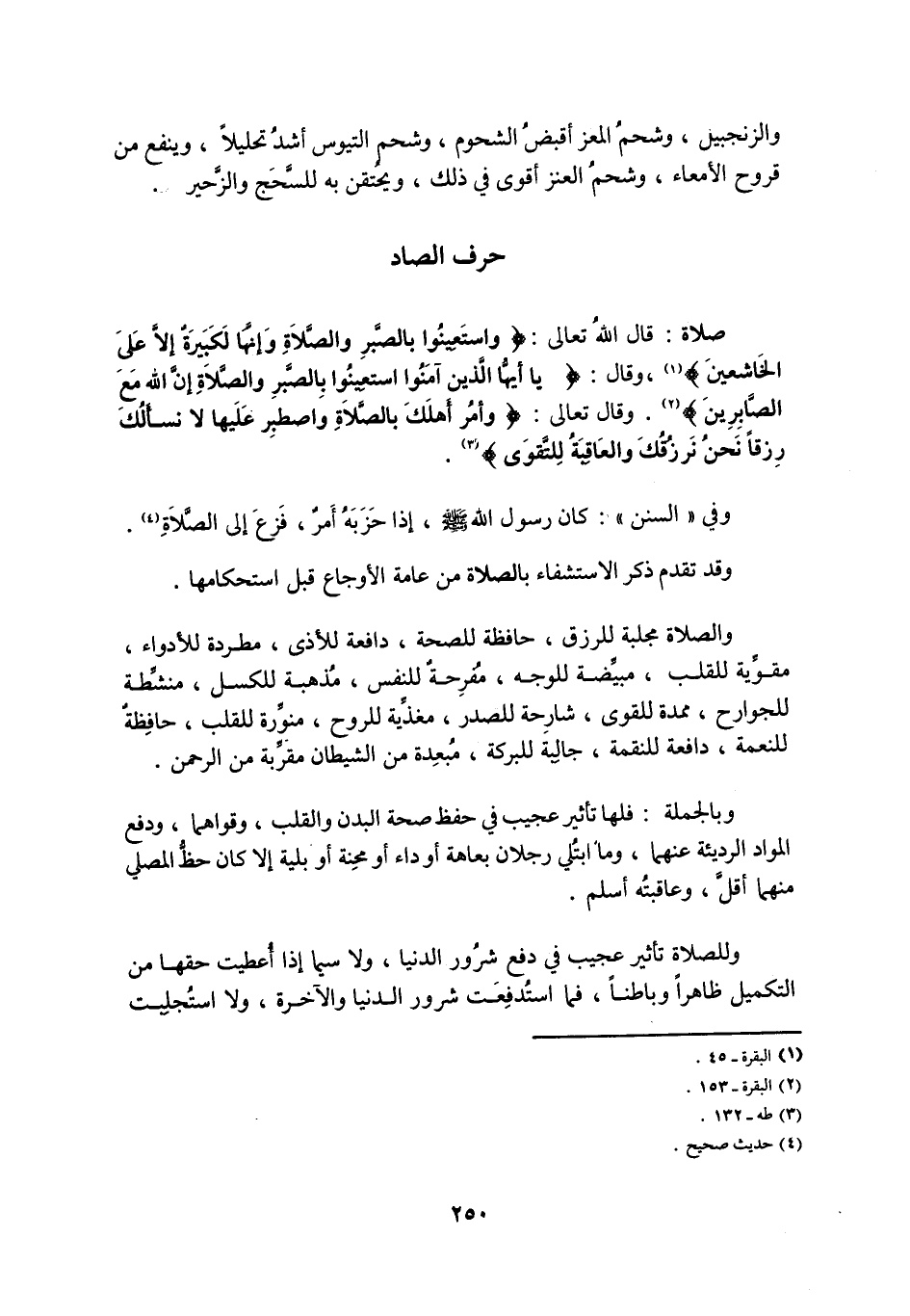 وَالصَّلَاةُ مَجْلَبَةٌ لِلرِّزْقِ، حَافِظَةٌ لِلصِّحَّةِ، دَافِعَةٌ لِلْأَذَى، مَطْرَدَةٌ لِلْأَدْوَاءِ، مُقَوِّيَةٌ لِلْقَلْبِ، مُبَيِّضَةٌ لِلْوَجْهِ، مُفْرِحَةٌ لِلنَّفْسِ، مُذْهِبَةٌ لِلْكَسَلِ، مُنَشِّطَةٌ لِلْجَوَارِحِ، مُمِدَّةٌ لِلْقُوَى، شَارِحَةٌ لِلصَّدْرِ، مُغَذِّيَةٌ لِلرُّوحِ، مُنَوِّرَةٌ لِلْقَلْبِ، حَافِظَةٌ لِلنِّعْمَةِ، دَافِعَةٌ لِلنِّقْمَةِ، جَالِبَةٌ لِلْبَرَكَةِ، مُبْعِدَةٌ مِنَ الشَّيْطَانِ مُقَرِّبَةٌ مِنَ الرَّحْمَنِ.