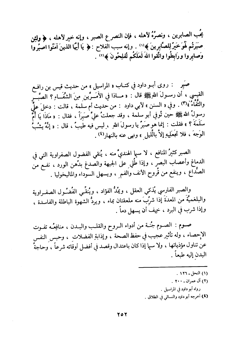 صبر: رَوَى أبو داود فِي كِتَابِ «الْمَرَاسِيلِ» مِنْ حَدِيثِ قيس بن رافع القيسي، أَنَّ رَسُولَ اللَّهِ صَلَّى اللَّهُ عَلَيْهِ وَسَلَّمَ قَالَ: «مَاذَا فِي الْأَمَرَّيْنِ مِنَ الشِّفَاءِ؟ الصَّبِرُ وَالثُّفَّاءُ» «3» . وَفِي «السُّنَنِ» لأبي داود: مِنْ حَدِيثِ أم سلمة، قَالَتْ: دَخَلَ عَلَيَّ رَسُولُ اللَّهِ صَلَّى اللَّهُ عَلَيْهِ وَسَلَّمَ حِينَ تُوُفِّيَ أبو سلمة، وَقَدْ جَعَلْتُ عَلَيَّ صَبِرًا، فَقَالَ: «مَاذَا يَا أم سلمة؟» فَقُلْتُ: إِنَّمَا هُوَ صَبِرٌ يَا رَسُولَ اللَّهِ، لَيْسَ فِيهِ طِيبٌ، قَالَ: «إِنَّهُ يَشُبُّ الْوَجْهَ، فَلَا تَجْعَلِيهِ إِلَّا بِاللَّيْلِ» وَنَهَى عَنْهُ بِالنَّهَارِ «4» .