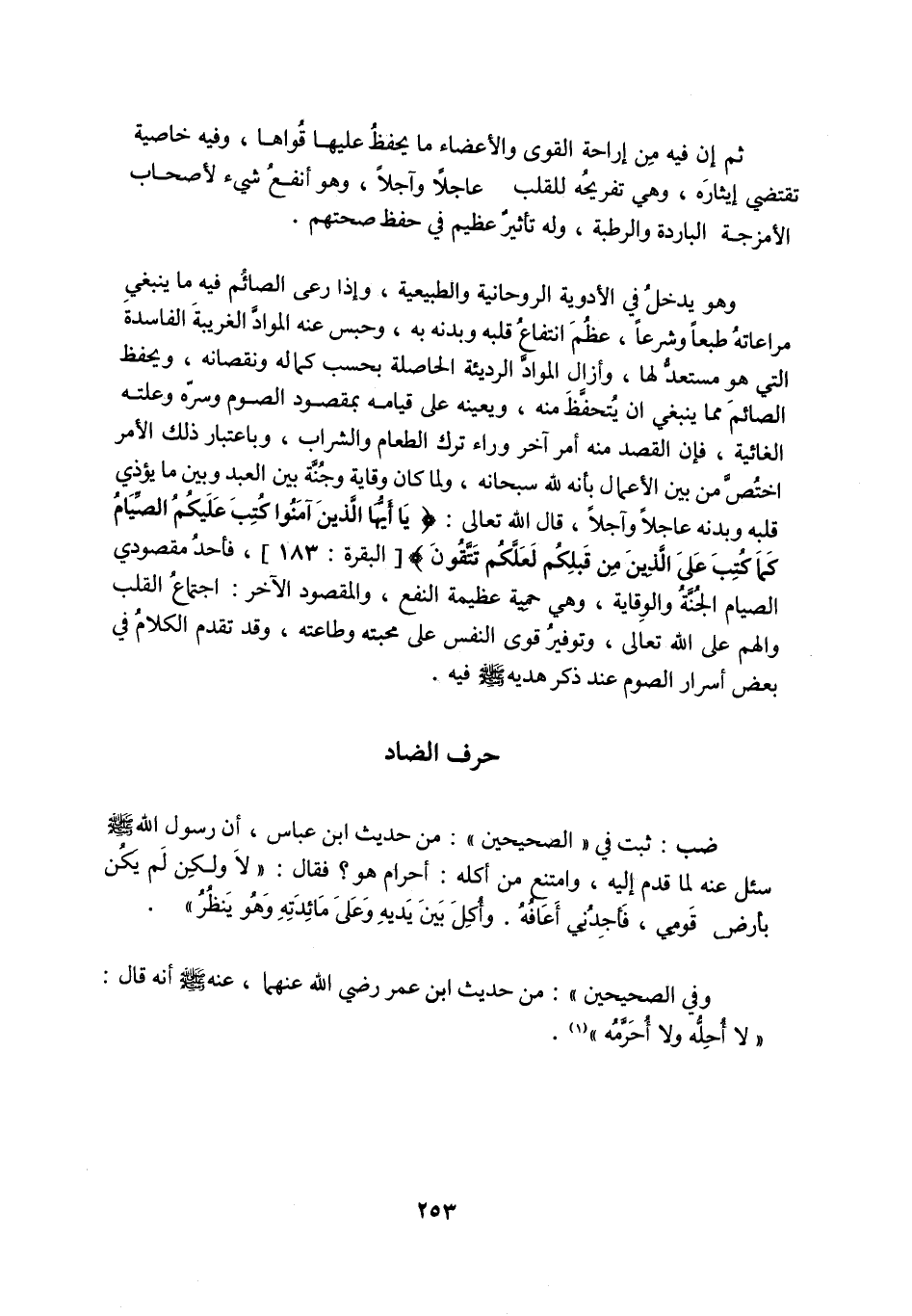 وَهُوَ يَدْخُلُ في الأدوية الروحانية والطبيعية، وإذا رعى الصَّائِمُ فِيهِ مَا يَنْبَغِي مُرَاعَاتُهُ طَبْعًا وَشَرْعًا، عَظُمَ انْتِفَاعُ قَلْبِهِ وَبَدَنِهِ بِهِ، وَحَبَسَ عَنْهُ الْمَوَادَّ الْغَرِيبَةَ الْفَاسِدَةَ الَّتِي هُوَ مُسْتَعِدٌّ لَهَا، وَأَزَالَ الْمَوَادَّ الرَّدِيئَةَ الْحَاصِلَةَ بِحَسَبِ كَمَالِهِ وَنُقْصَانِهِ، وَيَحْفَظُ الصَّائِمَ مِمَّا يَنْبَغِي أَنْ يَتَحَفَّظَ مِنْهُ، وَيُعِينُهُ عَلَى قِيَامِهِ بِمَقْصُودِ الصَّوْمِ وَسِرِّهِ وَعِلَّتِهِ الْغَائِيَّةِ، فَإِنَّ الْقَصْدَ مِنْهُ أَمْرٌ آخَرُ وَرَاءَ تَرْكِ الطَّعَامِ وَالشَّرَابِ، وَبِاعْتِبَارِ ذَلِكَ الْأَمْرِ اخْتَصَّ مِنْ بَيْنِ الْأَعْمَالِ بِأَنَّهُ لِلَّهِ سُبْحَانَهُ، وَلَمَّا كَانَ وِقَايَةً وَجُنَّةً بَيْنَ الْعَبْدِ وَبَيْنَ مَا يُؤْذِي قَلْبَهُ وَبَدَنَهُ عَاجِلًا وَآجِلًا، قَالَ اللَّهُ تعالى: يا أَيُّهَا الَّذِينَ آمَنُوا كُتِبَ عَلَيْكُمُ الصِّيامُ كَما كُتِبَ عَلَى الَّذِينَ مِنْ قَبْلِكُمْ لَعَلَّكُمْ تَتَّقُونَ [البقرة: 183] ، فَأَحَدُ مَقْصُودَيِ الصِّيَامِ الْجُنَّةُ وَالْوِقَايَةُ، وَهِيَ حِمْيَةٌ عَظِيمَةُ النَّفْعِ، وَالْمَقْصُودُ الْآخَرُ: اجْتِمَاعُ الْقَلْبِ وَالْهَمِّ عَلَى اللَّهِ تَعَالَى، وَتَوْفِيرُ قُوَى النَّفْسِ عَلَى محبته وَطَاعَتِهِ، وَقَدْ تَقَدَّمَ الْكَلَامُ فِي بَعْضِ أَسْرَارِ الصَّوْمِ عِنْدَ ذِكْرِ هَدْيِهِ صَلَّى اللَّهُ عَلَيْهِ وسلم فيه.