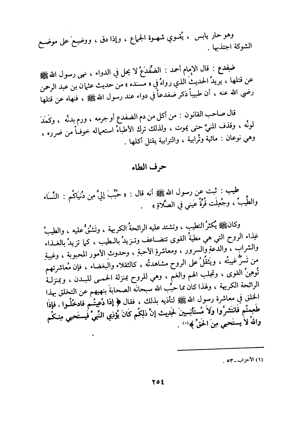 ضِفْدَعٌ: قَالَ الْإِمَامُ أَحْمَدُ: الضِّفْدَعُ لَا يَحِلُّ فِي الدَّوَاءِ، نَهَى رَسُولُ اللَّهِ صَلَّى اللَّهُ عَلَيْهِ وَسَلَّمَ عَنْ قَتْلِهَا، يُرِيدُ الْحَدِيثَ الَّذِي رَوَاهُ فِي «مُسْنَدِهِ» مِنْ حَدِيثِ عثمان بن عبد الرحمن رَضِيَ اللَّهُ عَنْهُ، أَنَّ طَبِيبًا ذَكَرَ ضِفْدَعًا فِي دَوَاءٍ عِنْدَ رَسُولِ اللَّهِ صَلَّى اللَّهُ عَلَيْهِ وَسَلَّمَ، فَنَهَاهُ عَنْ قَتْلِهَا