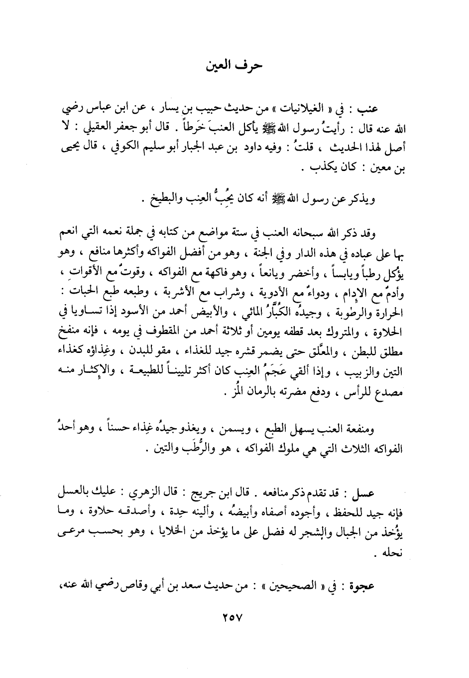 عِنَبٌ: فِي «الْغَيْلَانِيَّاتِ» مِنْ حَدِيثِ حبيب بن يسار، عَنِ ابْنِ عَبَّاسٍ رَضِيَ اللَّهُ عَنْهُ قَالَ: رَأَيْتُ رَسُولَ اللَّهِ صَلَّى اللَّهُ عَلَيْهِ وَسَلَّمَ يَأْكُلُ الْعِنَبَ خَرْطًا. قَالَ أَبُو جَعْفَرٍ الْعُقَيْلِيُّ: لَا أَصْلَ لِهَذَا الْحَدِيثِ، قُلْتُ: وَفِيهِ داود بن عبد الجبار أبو سليم الكوفي، قَالَ يَحْيَى بْنُ مَعِينٍ: كَانَ يَكْذِبُ.